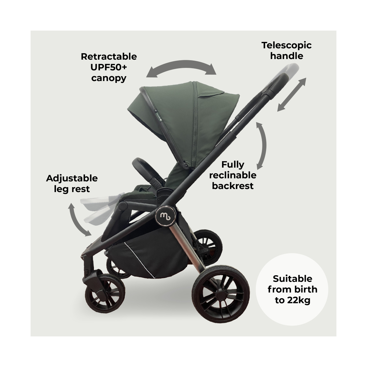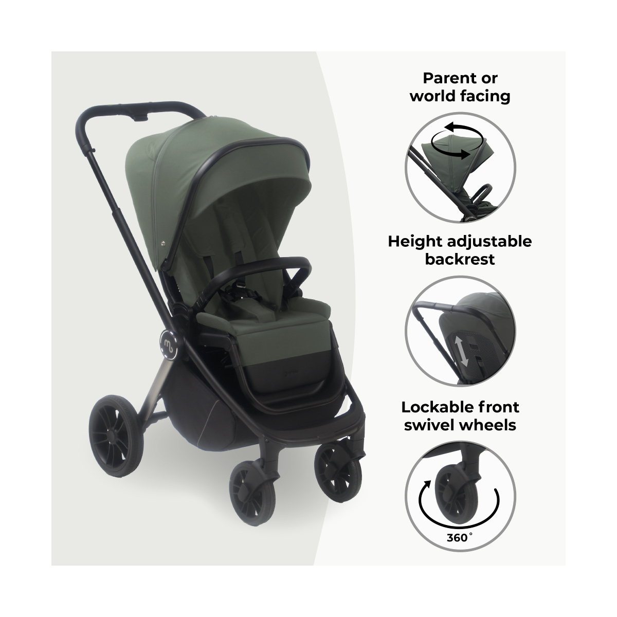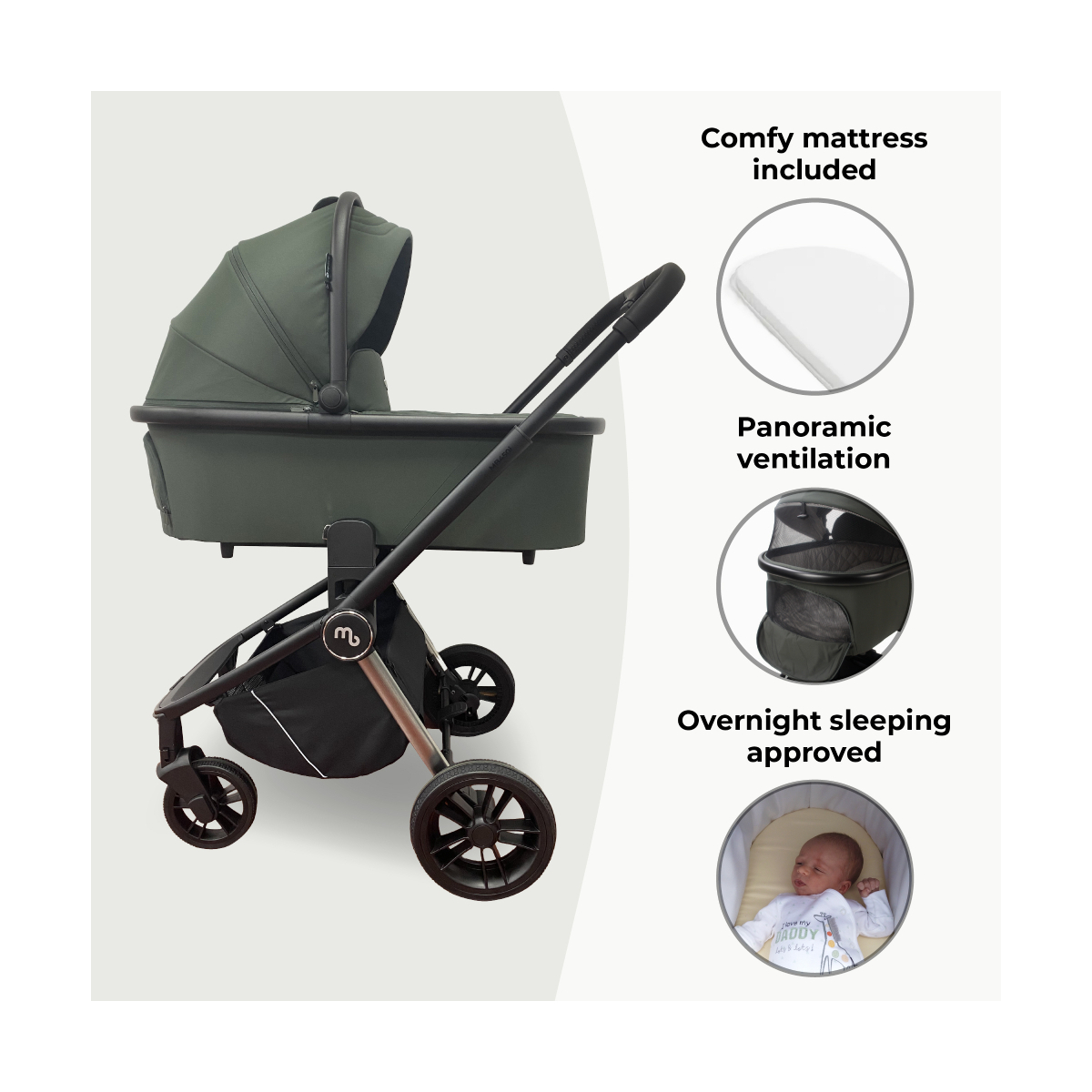 The included carrycot in the MB450 3-in-1 travel system provides a comfy place for your newborn to sleep whilst you're out and about.