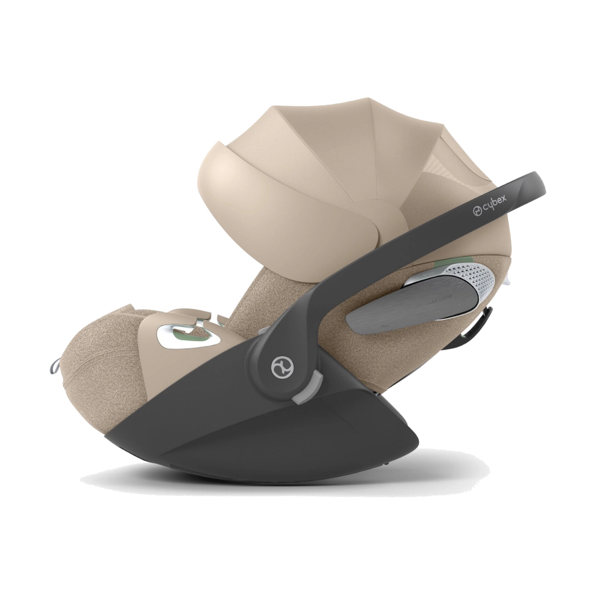The CYBEX Cloud T PLUS i-Size infant carrier is suitable from birth to approximately 2 years (45–87cm) and delivers outstanding comfort and flexibility both in and out of the car. Groundbreaking Stretch & Lie-Flat Technology — featuring a recline hinge at the hip — creates a simultaneous flattened back and extended leg rest, preventing the head from falling forward and supporting healthy lung development.
