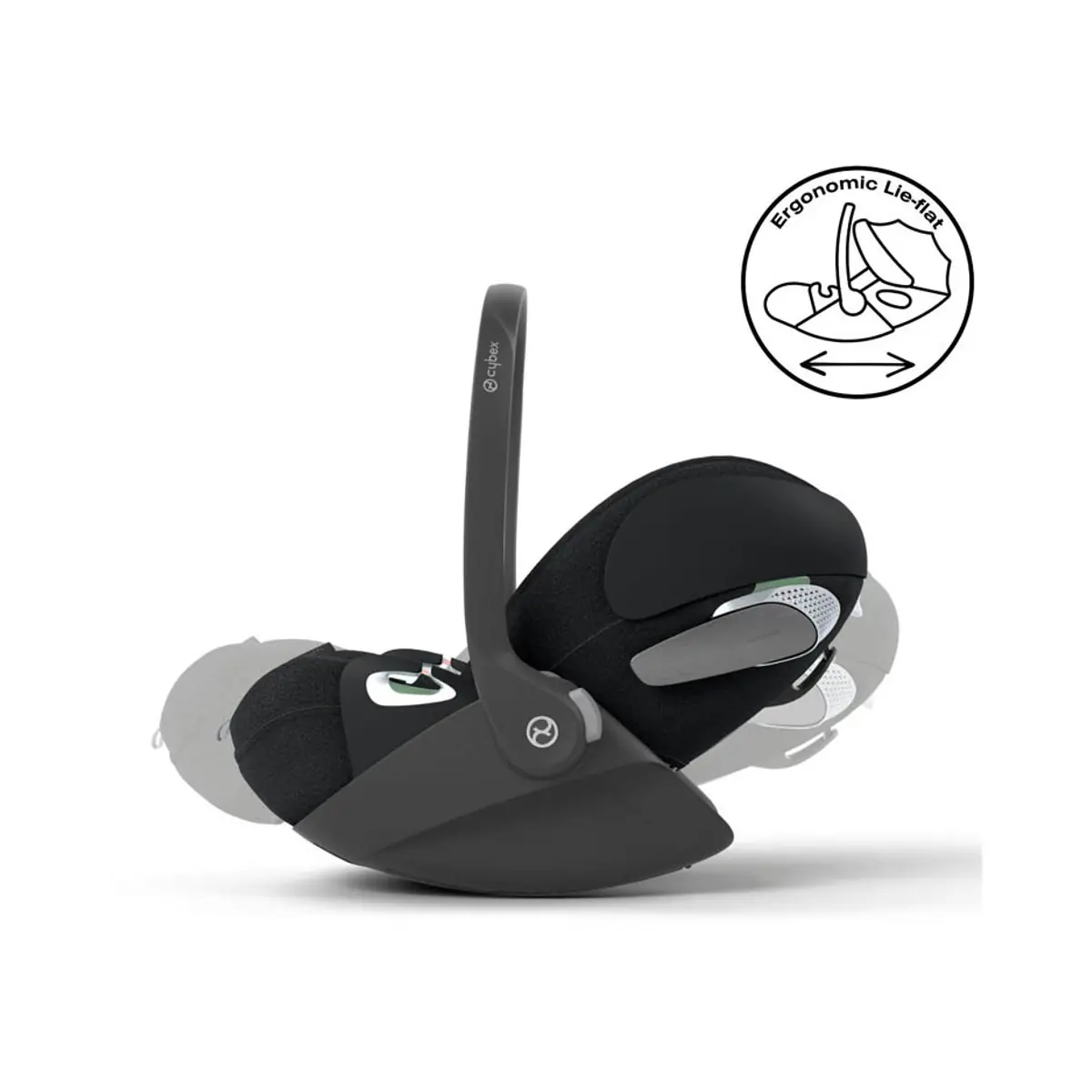 The Cybex Cloud T PLUS i-Size infant carrier is suitable from birth to approximately 2 years (45–87cm) and delivers outstanding comfort and flexibility both in and out of the car. Groundbreaking Stretch & Lie-Flat Technology — featuring a recline hinge at the hip — creates a simultaneous flattened back and extended leg rest, preventing the head from falling forward and supporting healthy lung development.