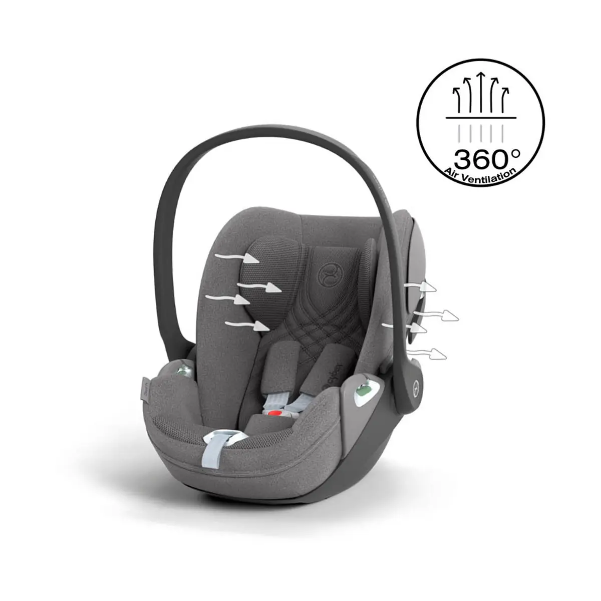 The CYBEX Cloud T PLUS i-Size infant carrier is suitable from birth to approximately 2 years (45–87cm) and delivers outstanding comfort and flexibility both in and out of the car. Groundbreaking Stretch & Lie-Flat Technology — featuring a recline hinge at the hip — creates a simultaneous flattened back and extended leg rest, preventing the head from falling forward and supporting healthy lung development.