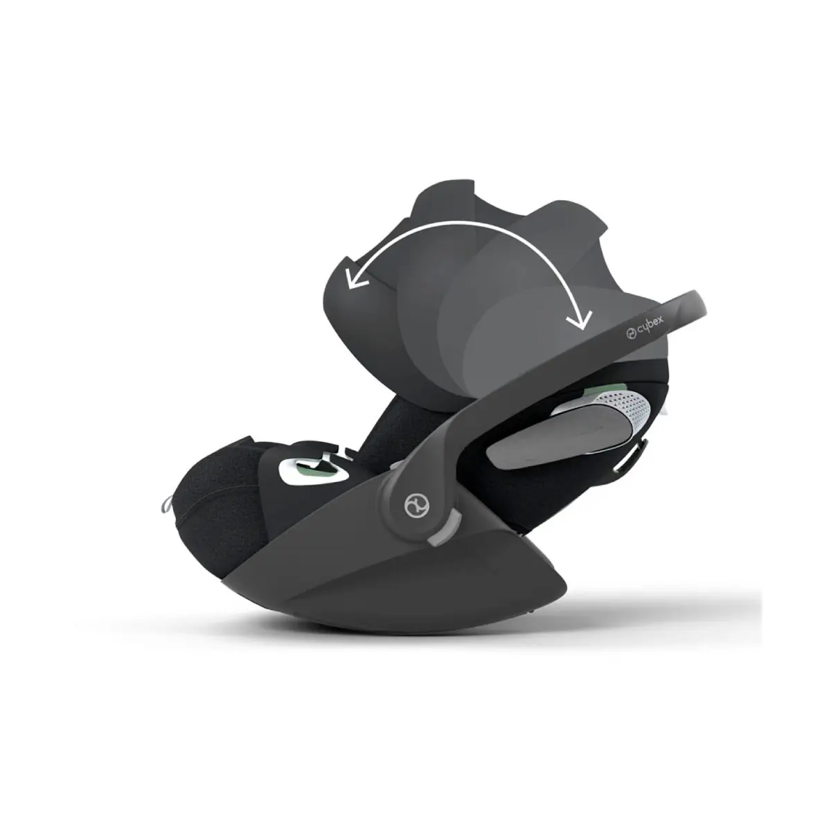 The CYBEX Cloud T PLUS i-Size infant carrier is suitable from birth to approximately 2 years (45–87cm) and delivers outstanding comfort and flexibility both in and out of the car. Groundbreaking Stretch & Lie-Flat Technology — featuring a recline hinge at the hip — creates a simultaneous flattened back and extended leg rest, preventing the head from falling forward and supporting healthy lung development.