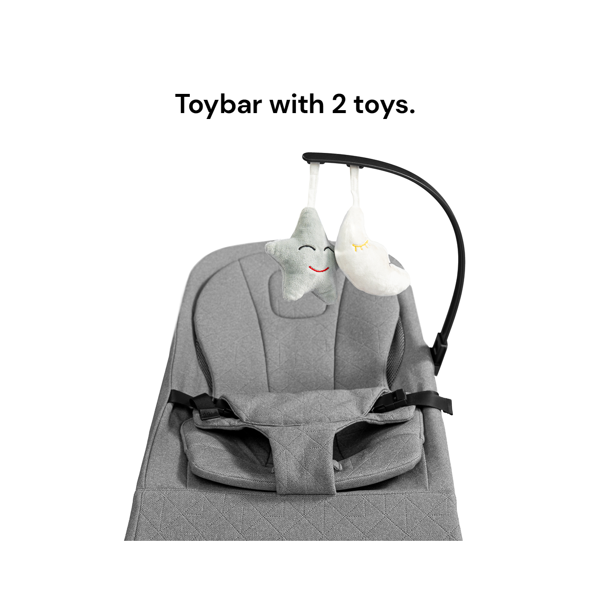 For added fun, the bouncer includes a toy bar with two engaging toys to stimulate your baby's senses. Traveling is a breeze with the included carrybag, and keeping the bouncer clean is simple with its removable, machine-washable cover.