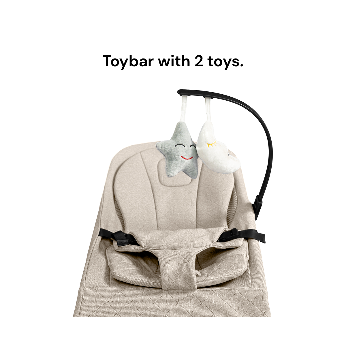 For added fun, the bouncer includes a toy bar with two engaging toys to stimulate your baby's senses. Traveling is a breeze with the included carrybag, and keeping the bouncer clean is simple with its removable, machine-washable cover.