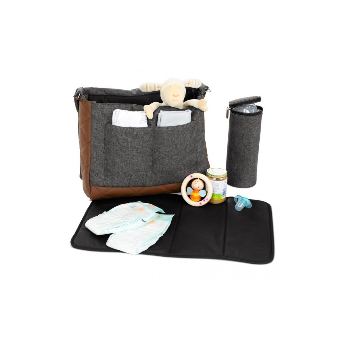The modern changing bag with exclusive leather-look detailing has a large main compartment ideal for storing nappies and bottles. Then there are various pockets offering a safe place for all the little items. The changing mat supplied with the product provides a hygienic underlay wherever you need to change your baby’s nappy. The bag sits comfortably on the shoulder with its broad leather-look strap.