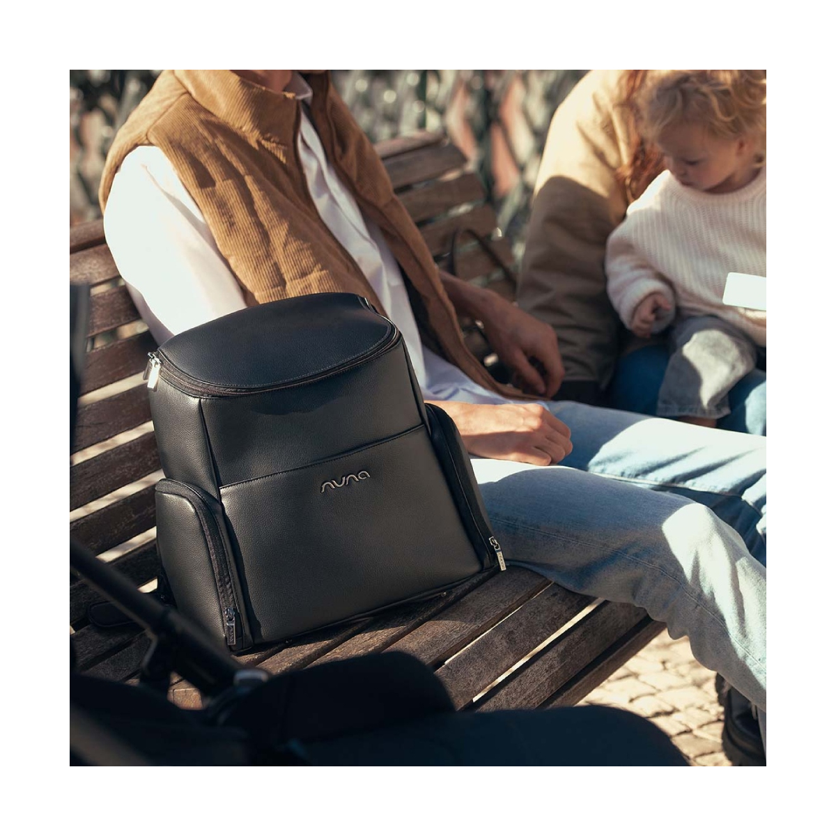 "The Essential bag redefines everyday luxury with its chic leatherette styling and versatile parenthood functionality. Crafted as a multi-tasking backpack that also serves as a changing bag, it features a laptop-friendly design with a thoughtful array of exterior and interior pockets, a handy changing pad clutch, and a luggage trolley sleeve for travel convenience.