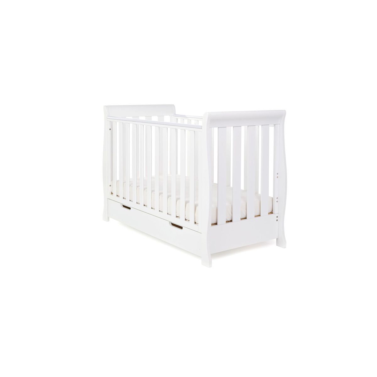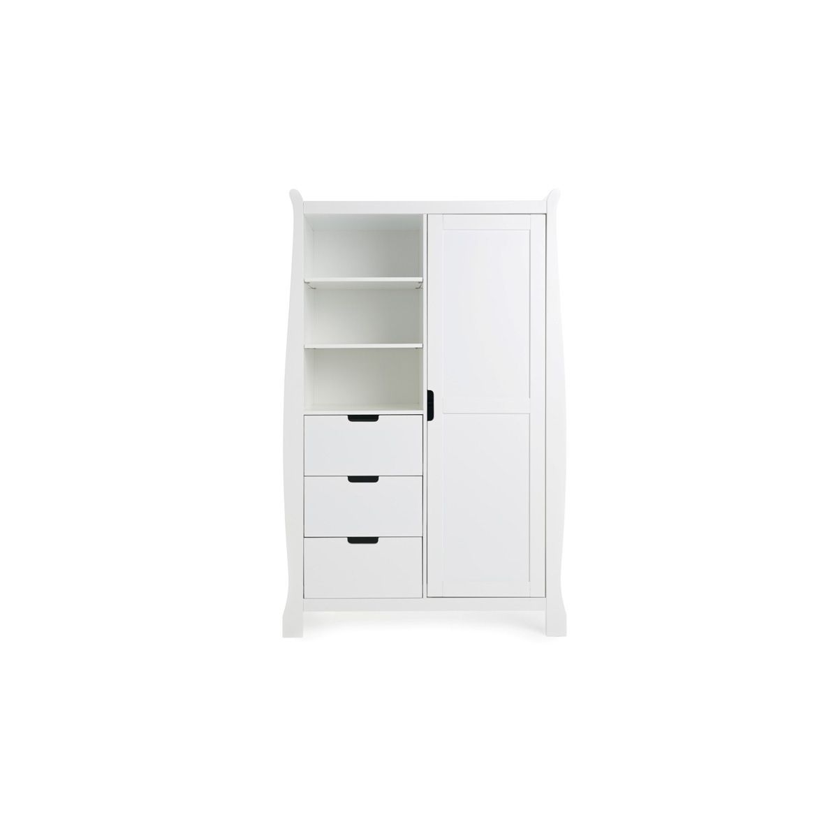 The Obaby Stamford furniture range offers families the perfect combination of style, quality and practicality. For those looking for all of the great features of a full size cot bed but with limited space, the Stamford mini sleigh cot bed is the perfect addition to any nursery. Its elegant scroll design offers traditional styling while its slatted ends add a contemporary touch. The included changing unit and wardrobe are the ideal choice for parent’s looking for perfect design, without compromising on features and provide all the storage options you could possible need.