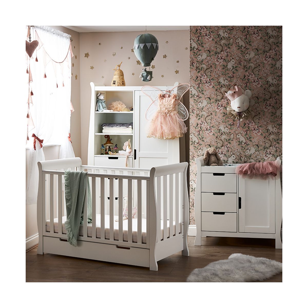 To complete the perfect nursery furniture set is the Stamford wardrobe. The quality of the design is complimented perfectly by the generous storage options available. A full height, soft close door encloses the main cupboard section with 2 hanging rails for storing little one’s adorable outfits.