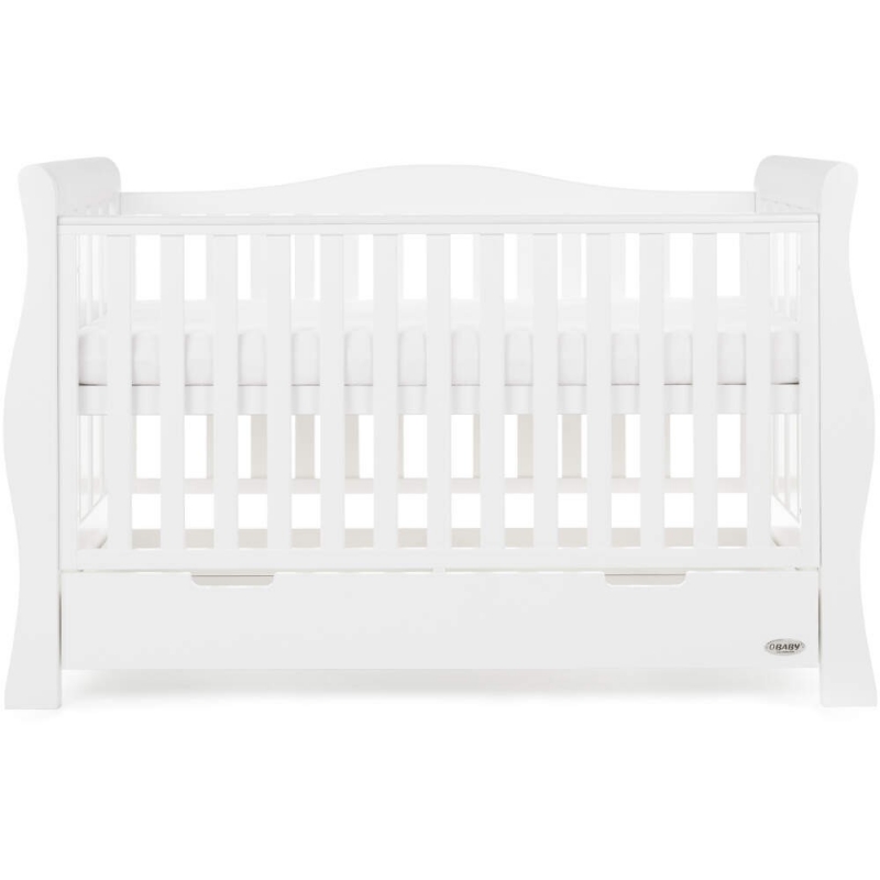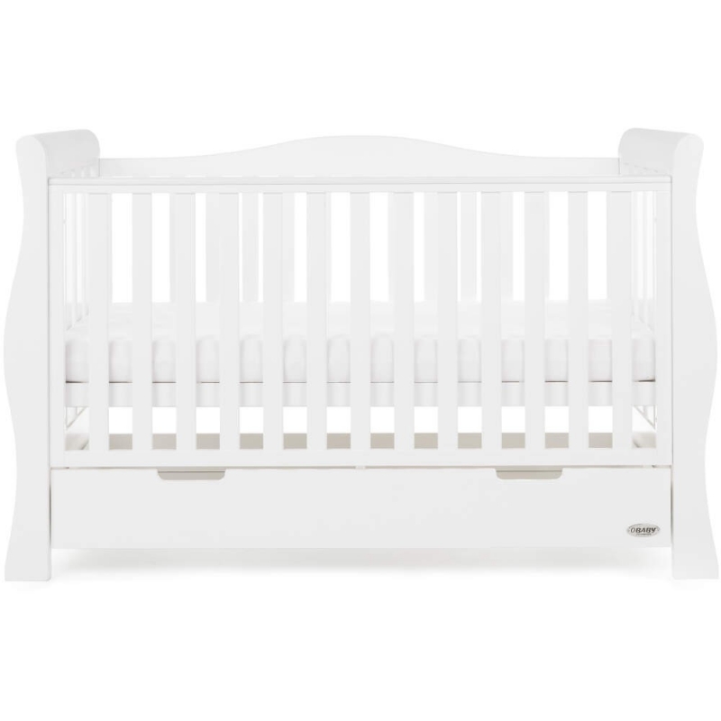 The Obaby Stamford furniture range offers families the perfect combination of style, quality and practicality. Standing proud at the top of the range is the beautiful Stamford Luxe sleigh cot bed. Its deluxe, hand-shaped end scrolls flow perfectly into the curved rear side rail creating a unique look which truly sets the Luxe apart from other sleigh cot beds.As your child grows, so does the Stamford Luxe cot bed. Once your child is old enough to progress from cot mode to a toddler bed, you can use the included safety rail for support until they get used to their big bed. Remove the side rails to make a beautiful toddler bed and once they outgrow this, the Luxe can become a useful day bed for lounging and relaxing. The included matching under drawer slides neatly under the cot bed and offers parent’s that much needed extra storage space for their little one’s belongings without taking up valuable space elsewhere.