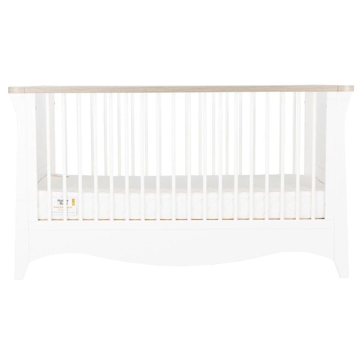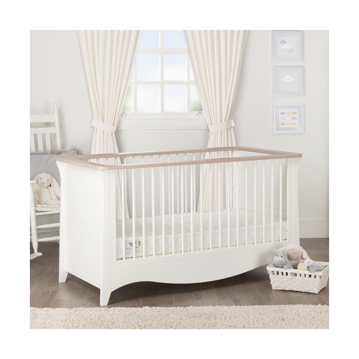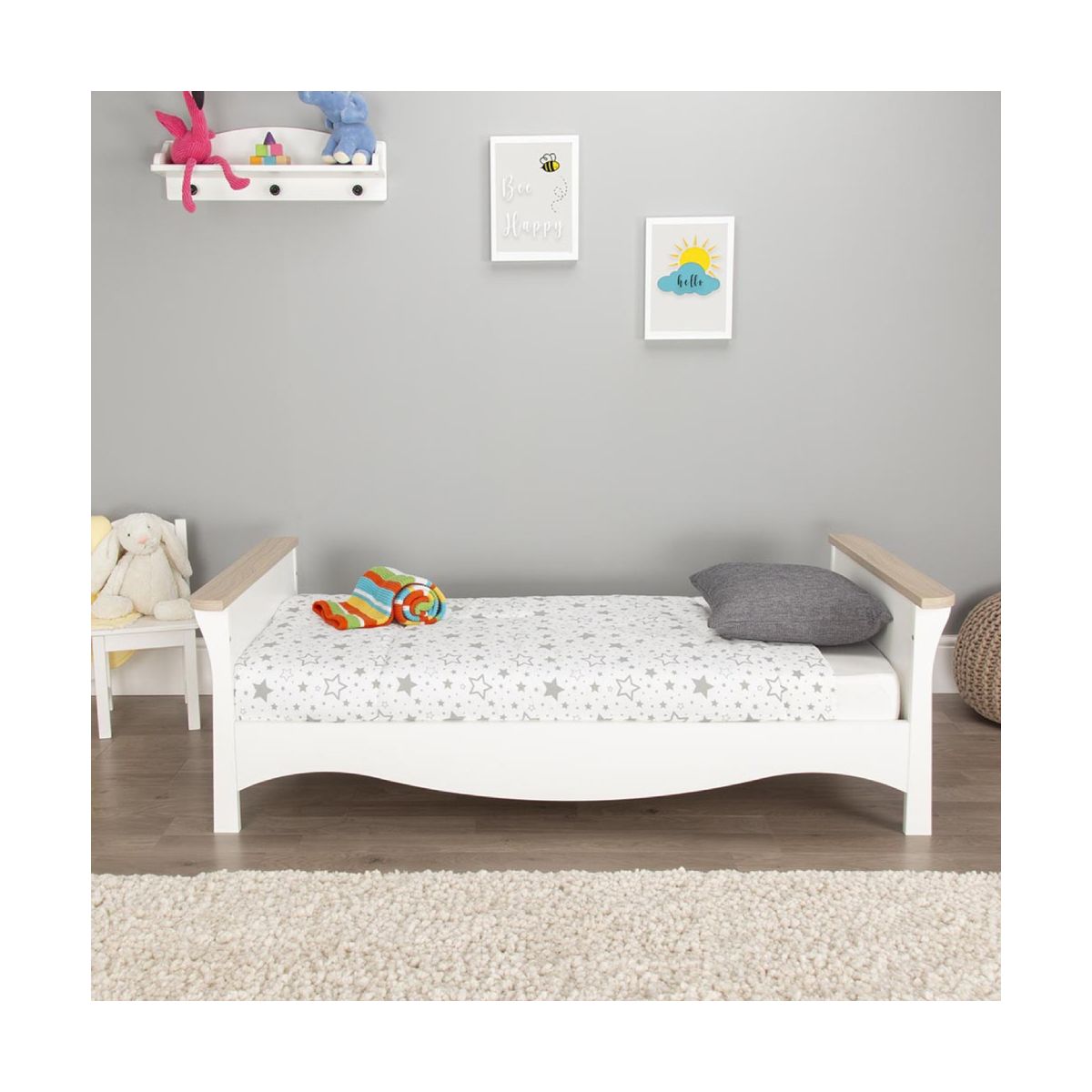 Classic shape with a modern contemporary end of CuddleCo Clara Cot Bed will be a great choice to any nursery room. This stylish cot bed is suitable from birth and can be converted into a modern toddler bed, which lasts up to approx. 5 years old. It features fixed rails with elegant cylindrical bars and tasteful finish on the top end. The functional base can be adjusted into 3 different positions for comfortable usage and protection from escape attempts. This furniture is carefully designed in Great Britain and made of solid pine and manufactured wood.