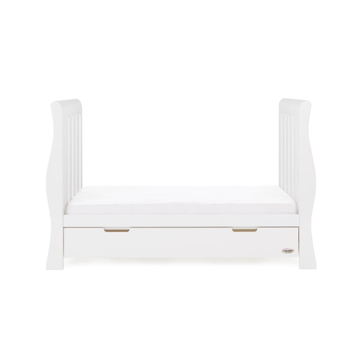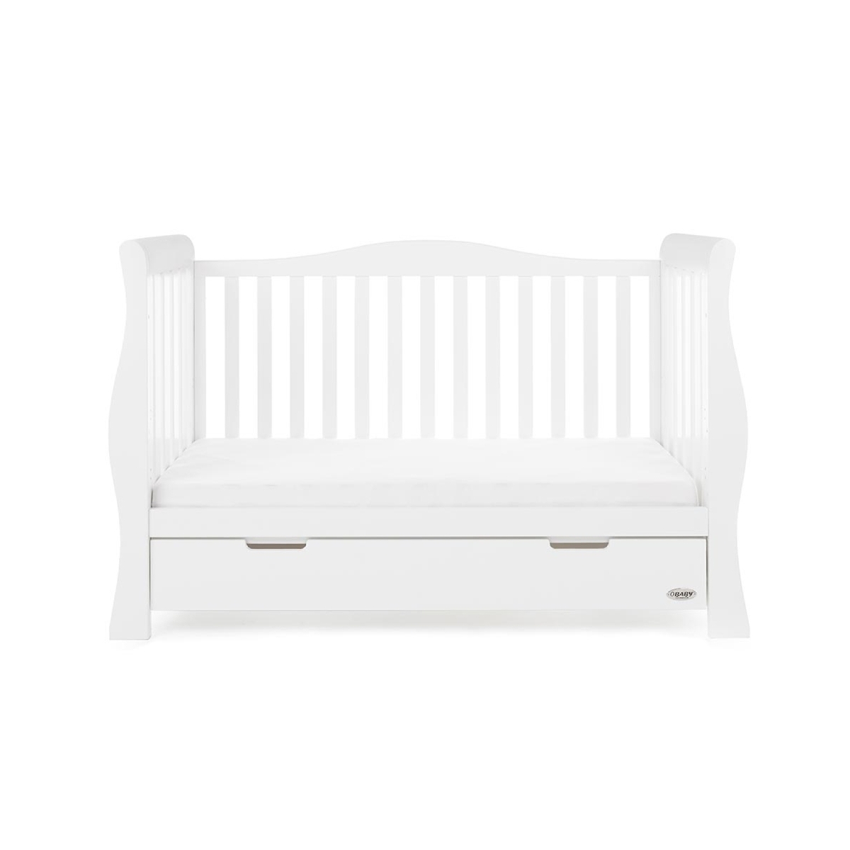Standing proud at the top of the range is the beautiful Stamford Luxe sleigh cot bed. The Luxe cot bed can adapt to suit every stage of your little one’s early development. Starting as a cot, the Luxe features an adjustable mattress base that can be lowered as your baby learns to sit and stand, so that they are safe and secure at all times while the presence of a teething rail helps to protect their delicate first teeth. Once your child is old enough to progress, the Luxe can be transformed into a toddler bed, with or without safety rail, that is suitable to approximately four years old. And finally, when they outgrow this, the Luxe can become a useful day bed for lounging and relaxing. Requires an Obaby 140 x 70cm mattress. The integrated under drawer has a huge 77L capacity, smoothly glides on runners and fits neatly under the cot bed.