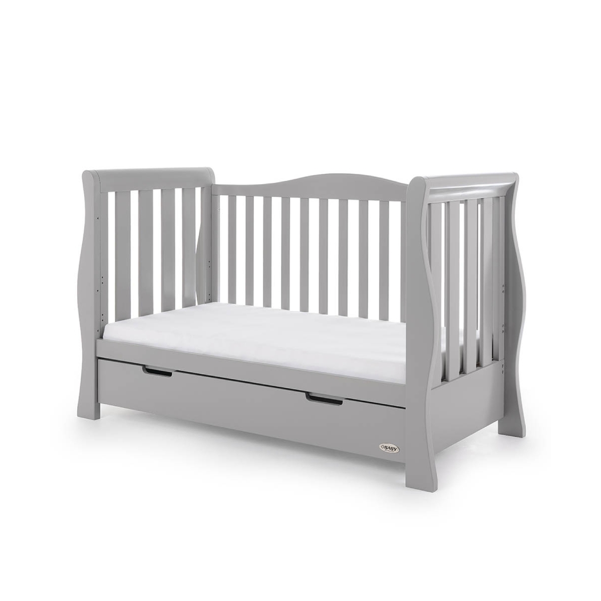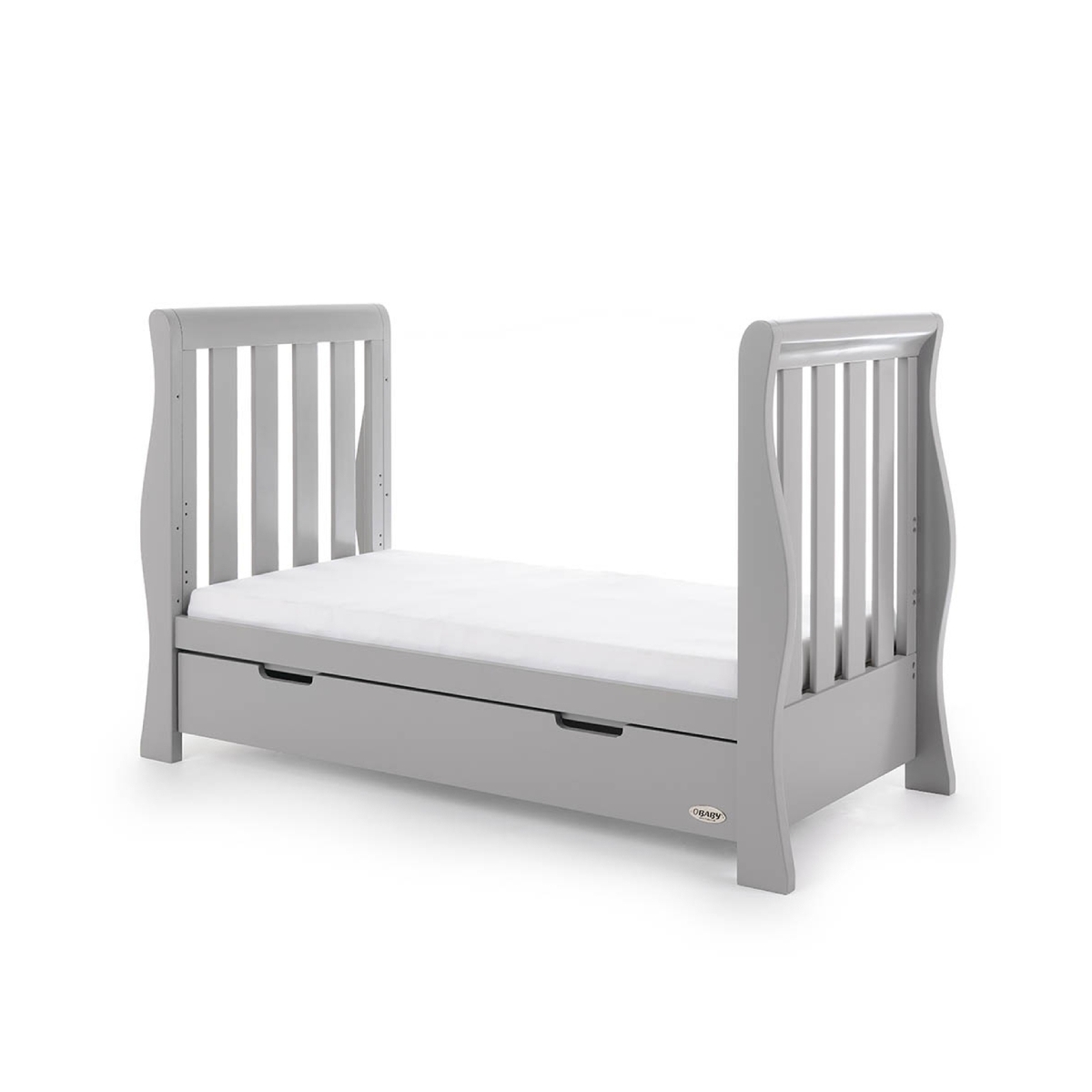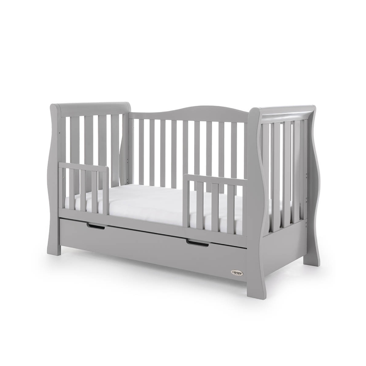 Standing proud at the top of the range is the beautiful Stamford Luxe sleigh cot bed. The Luxe cot bed can adapt to suit every stage of your little one’s early development. Starting as a cot, the Luxe features an adjustable mattress base that can be lowered as your baby learns to sit and stand, so that they are safe and secure at all times while the presence of a teething rail helps to protect their delicate first teeth. Once your child is old enough to progress, the Luxe can be transformed into a toddler bed, with or without safety rail, that is suitable to approximately four years old. And finally, when they outgrow this, the Luxe can become a useful day bed for lounging and relaxing. Requires an Obaby 140 x 70cm mattress. The integrated under drawer has a huge 77L capacity, smoothly glides on runners and fits neatly under the cot bed.