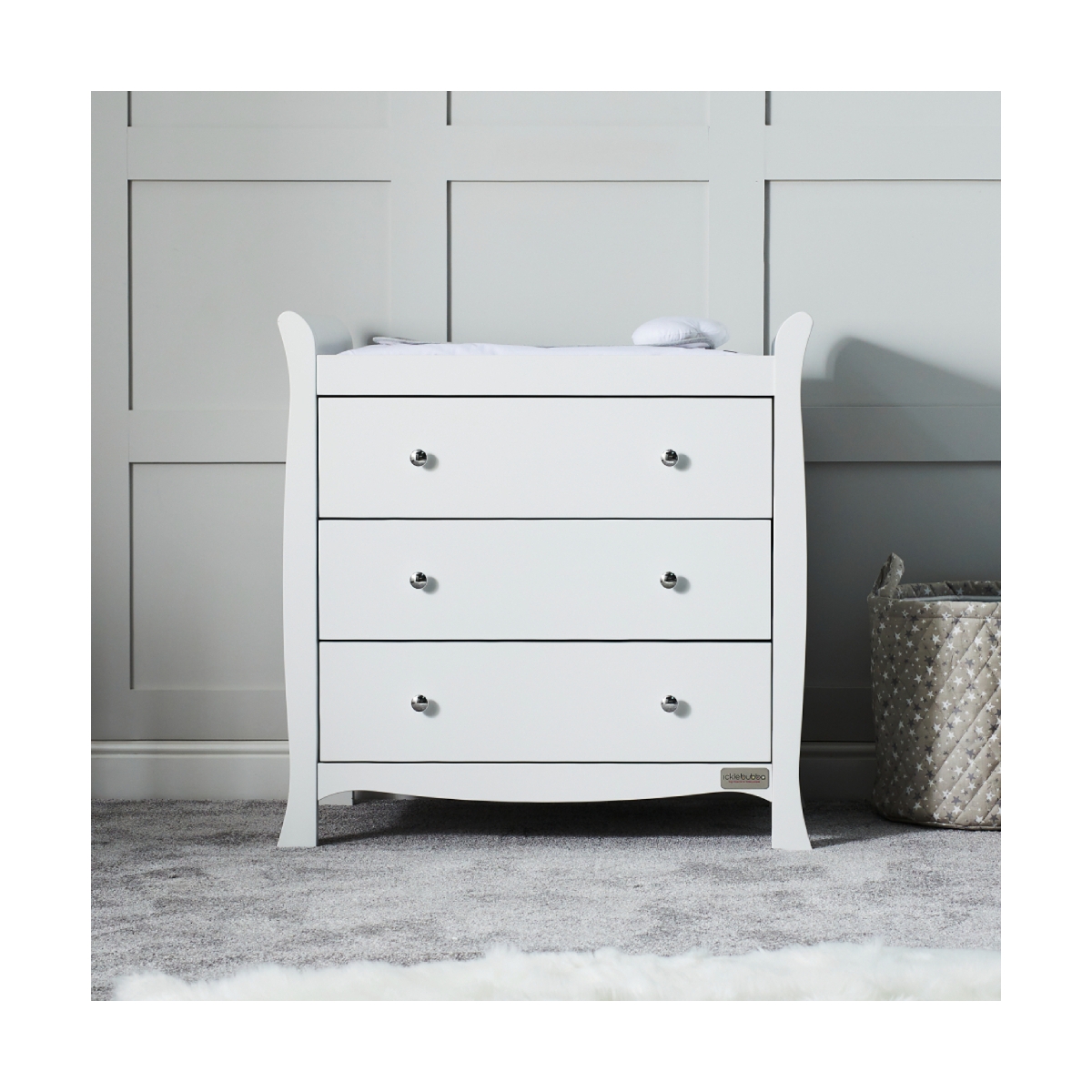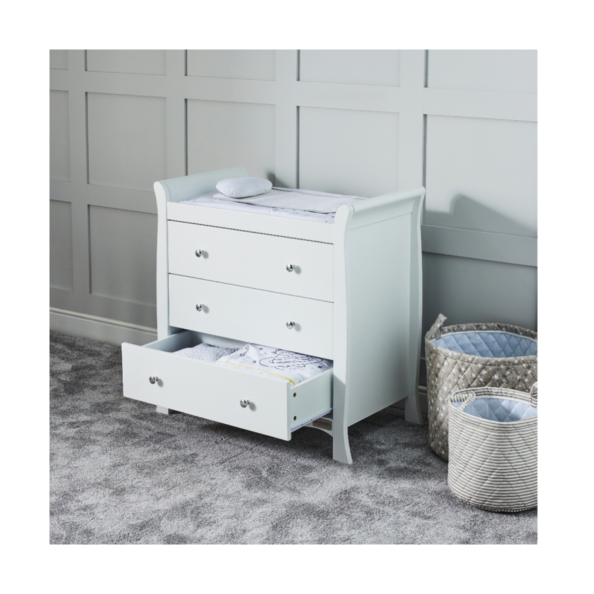 This sleight shaped Ickle Bubba Snowdon Changing Unit / Chest stands an excellent addition to Snowdon Mini or Classic Cot Bed. This beautifully designed piece of furniture comes with 3 full-with drawers with elegant handles. Its integrated changing station on the top stands an ideal place for a nappy change and fits all standard sized changing mats up to 76 x 46 cm. The Snowdon Changing Unit features simply stylish surface , which is super easy to wipe clean.