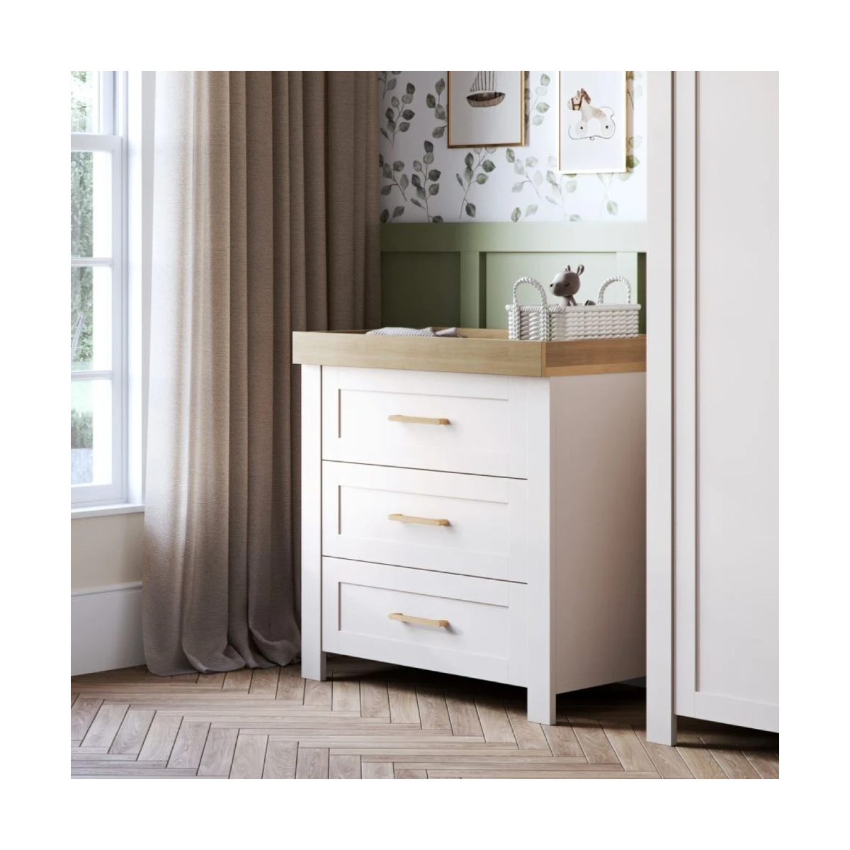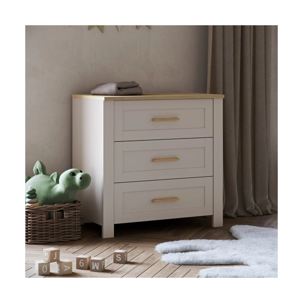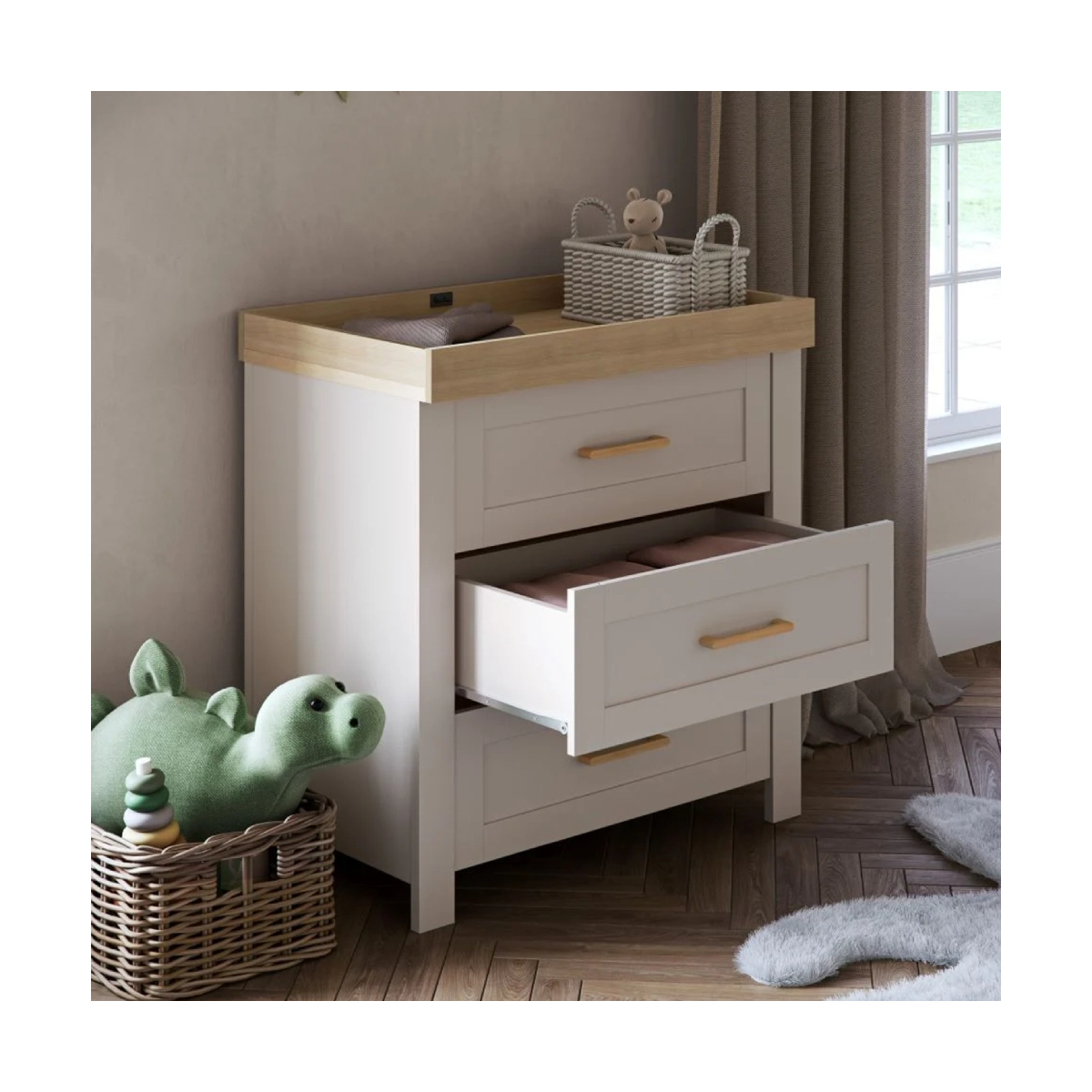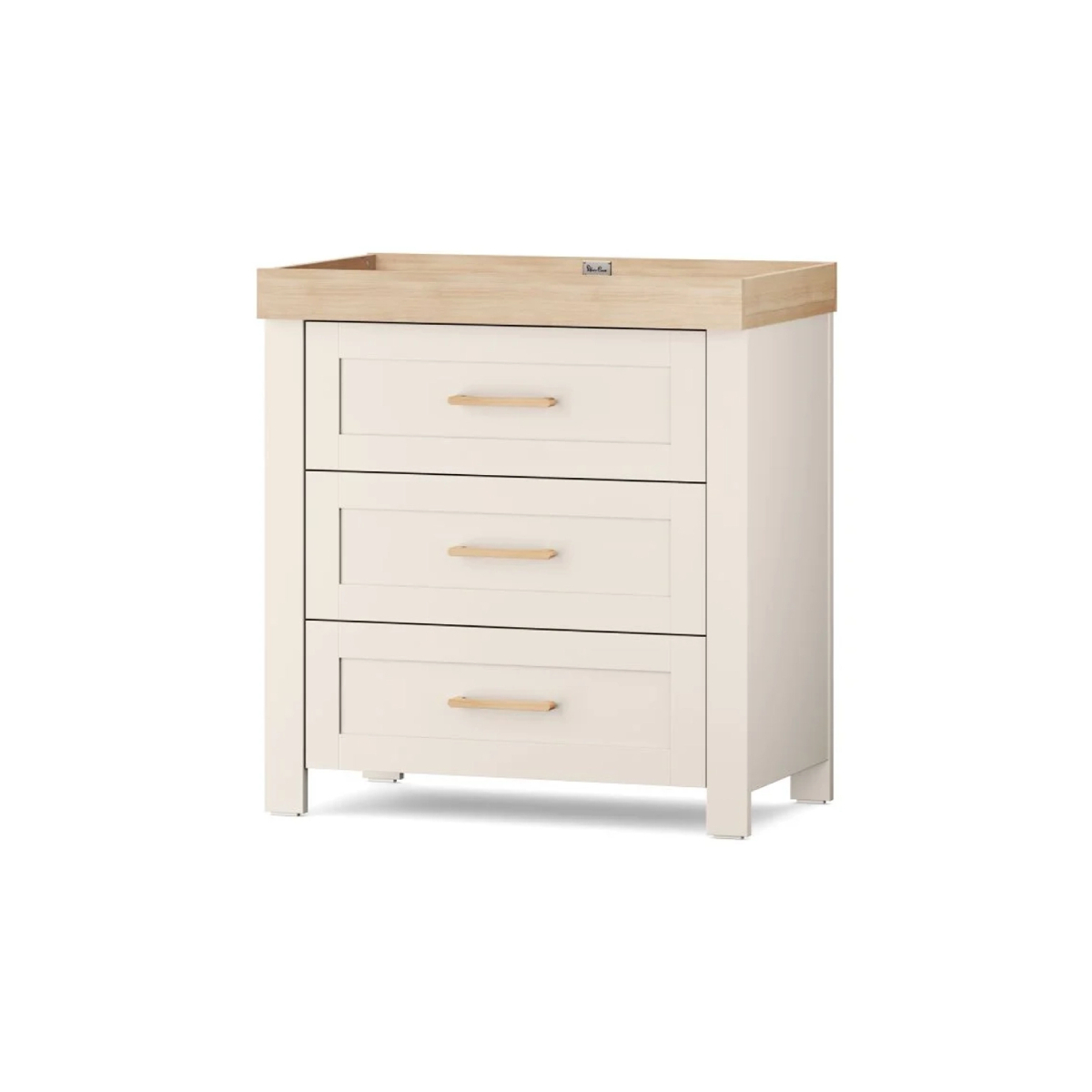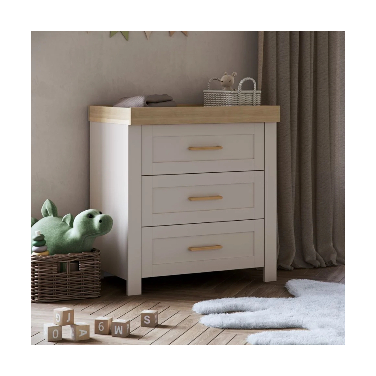 Stay organised in your nursery with the Seville full size dresser, featuring three deep drawers with plenty of space for your baby’s essentials and a removable changer top. With clean, elegant lines and warm tones of soft cashmere and natural oak, Seville brings a fresh and calming feeling into any nursery space. With a timeless design and long-lasting quality, our Seville nursery furniture set can be enjoyed for years to come as your family grows.