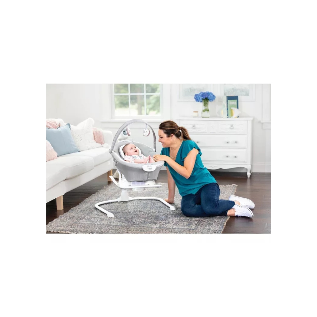 Graco Duet Sway 2 in 1 Swing Bear Tales with portable rocker is a multi-use swing that offers 2-in-1 features for twice the fun. This swing-and-rocker combination provides customized lounging for baby with adjustable features to create a relaxing environment that suits their personal preference. The swing features a removable, portable rocker seat so it’s easy to keep baby right by your side. Plus, a toy bar with removable soft toys will keep them entertained while you accomplish everything on your to-do list. The plug also provides added convenience, while a 5-point harness keeps baby cozy and secure.