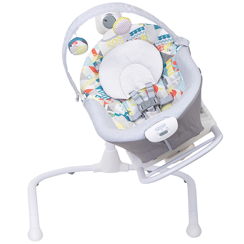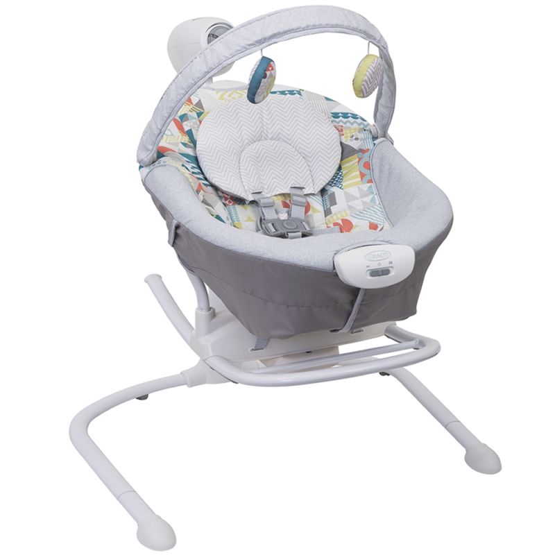 'The versatile Duet Sway™ Swing with portable rocker is a multi-use swing that offers 2-in-1 features for twice the fun. This swing-and-rocker combination provides customized lounging for baby with adjustable features to create a relaxing environment that suits their personal preference. The swing features a removable, portable rocker seat so it’s easy to keep baby right by your side. Plus, a toy bar with removable soft toys will keep them entertained while you accomplish everything on your to-do list. The plug also provides added convenience, while a 5-point harness keeps baby cozy and secure.