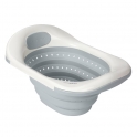 Designed to sit over any standard sink and with a soft, flexible and perforated basin, it means no heavy lifting or draining tubs filled with water, no bending over the main bath, no bad posture and no water mess or spills, just easy and gentle bathing for your new baby.