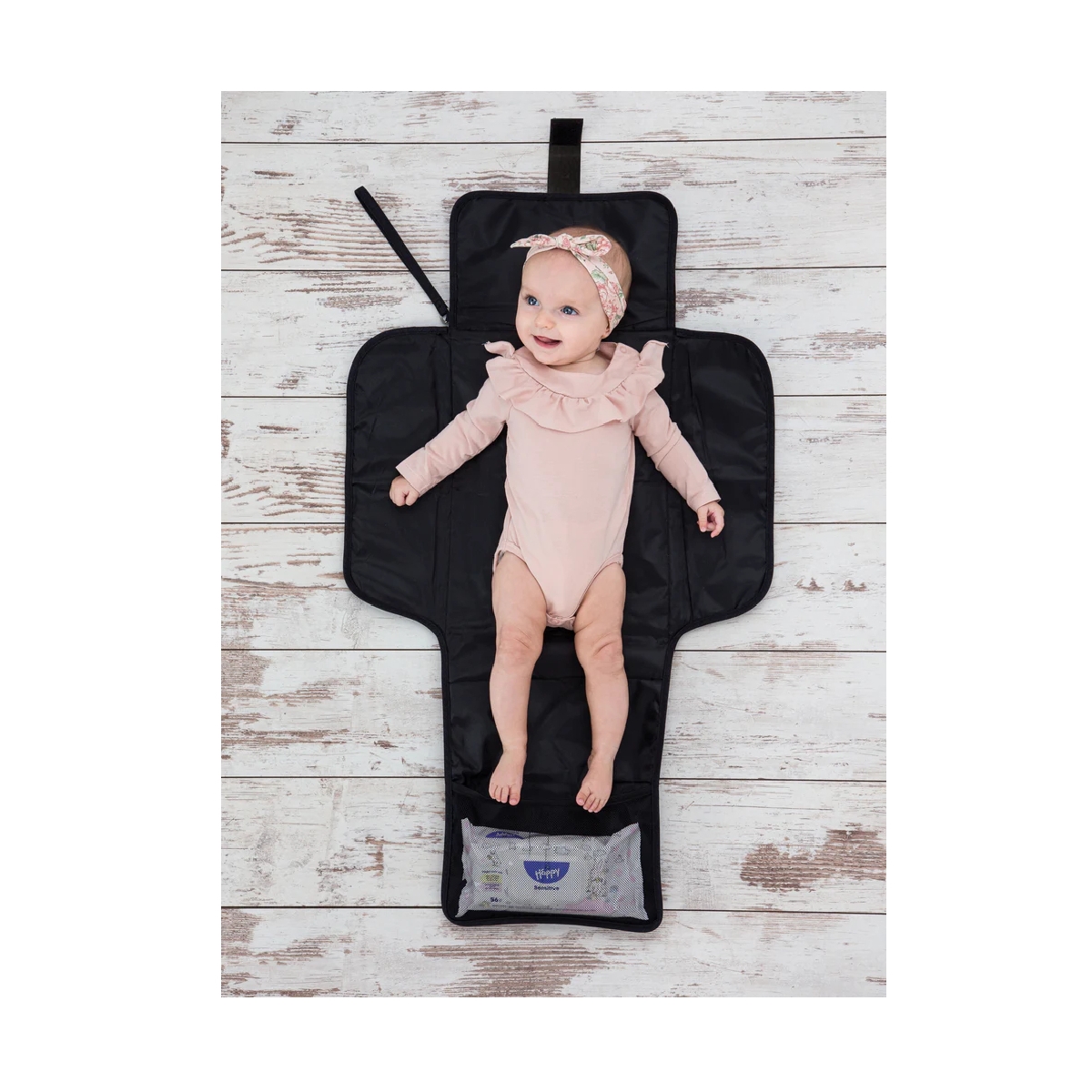 Simply unfold the nappy clutch, change station, using the Velcro strap, and hey presto you have a padded and wipe clean changing mat.
