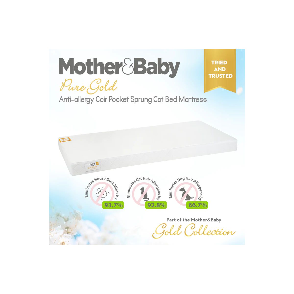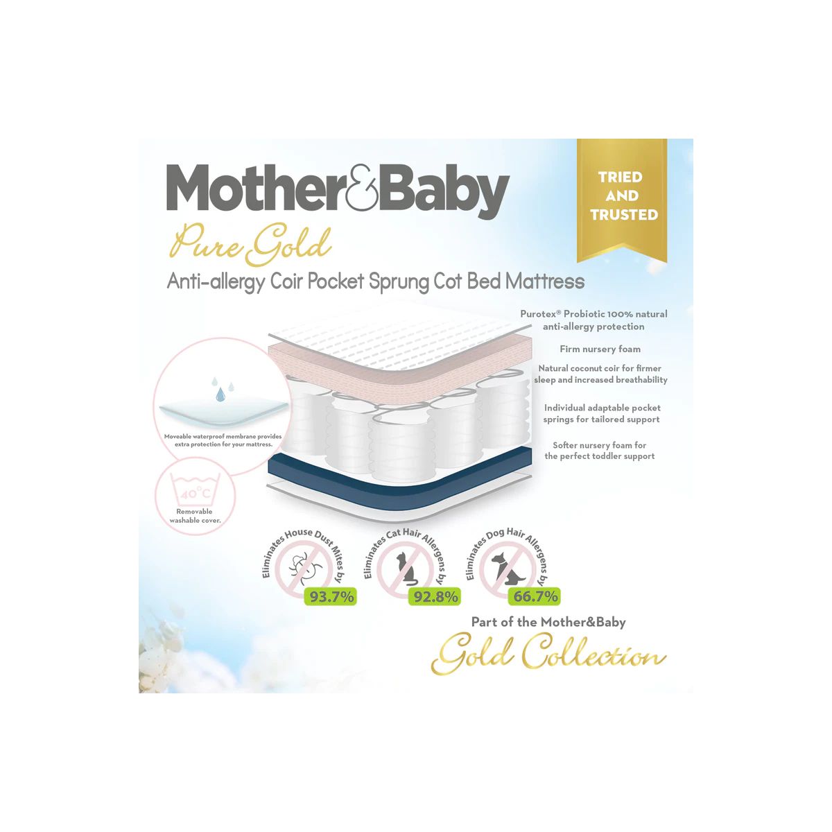 Our Mother&Baby Gold Collection Mattress guarantees a fresh, clean and healthier sleep environment. This is scientifically proven and approved by medical experts as Purotex® improves allergy symptoms. Tencel™ natural fibres are combined with Purotex® to enhance breathabilty and help aid cooling and temperature control from birth.