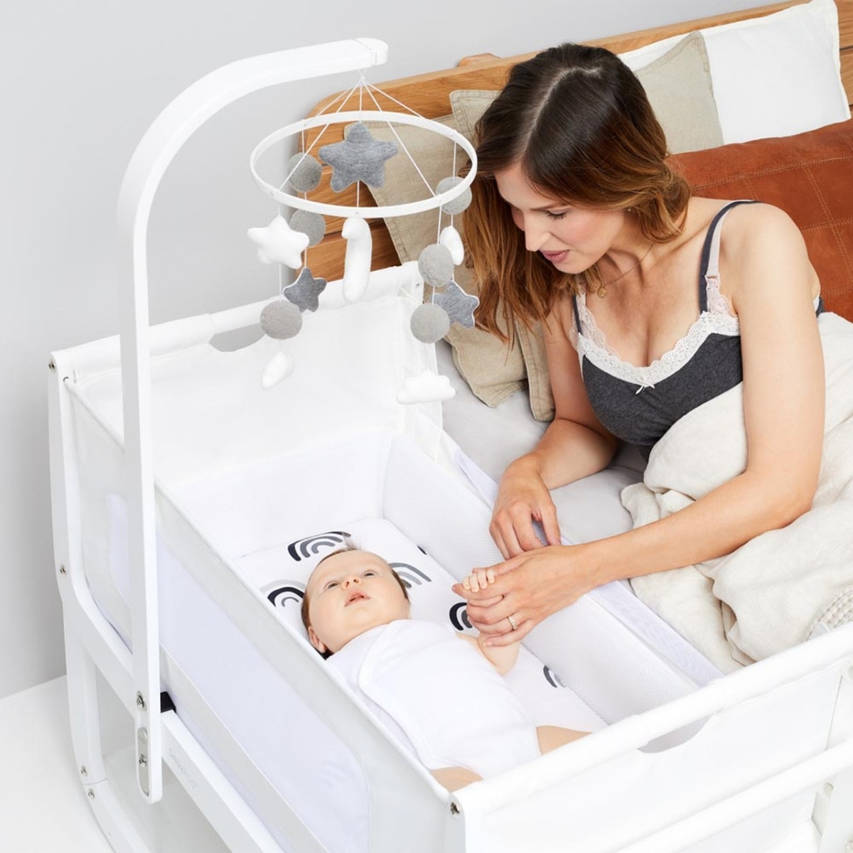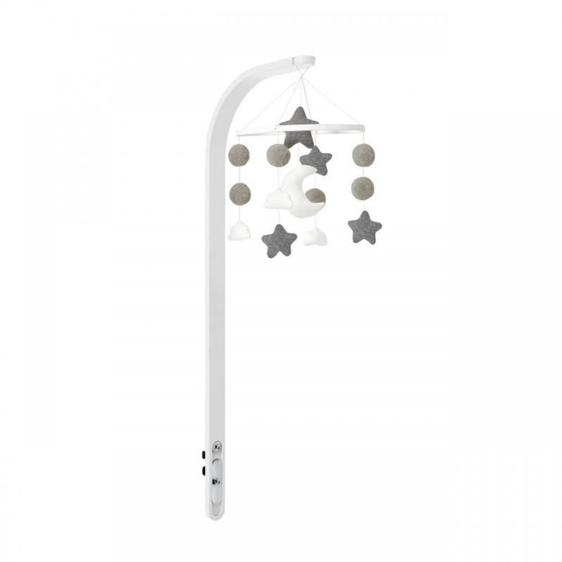 This Snuz Baby Mobile is a perfect addition for Snuz nursery furniture range. A celestial array of soft cotton charms including plush stars, puffy white clouds, and a curvy crescent moon will dance above your little one's head, which will help you to relax and soothe your baby to sleep. This adorable can be easily attached to the SnuzPod or SnuzCot, thanks to a high arm made of beech plywood.