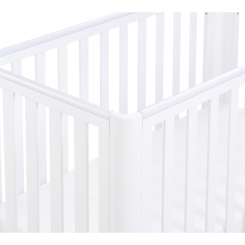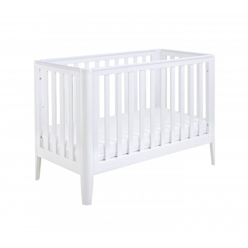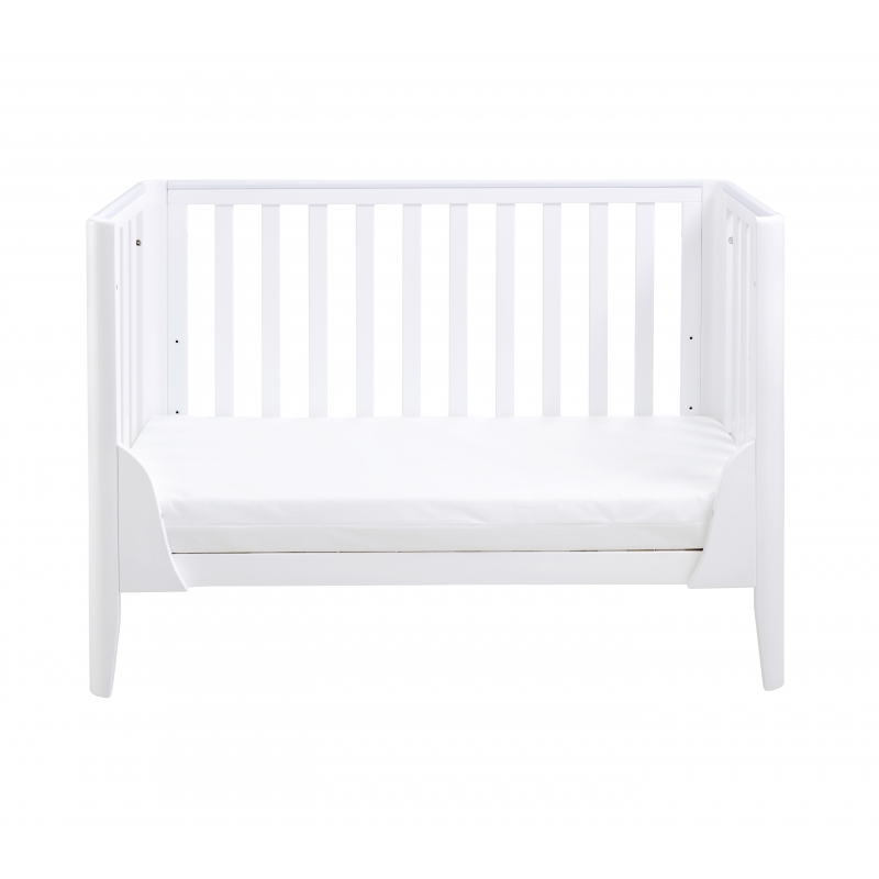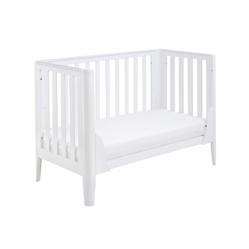 Made of solid pine. The Iris cot bed designed to last from birth until toddler age. 3 mattress base position for optimal sleep positions of early months, convert the cot to bed by remove the side, create a perfect toddler bed and a seater.