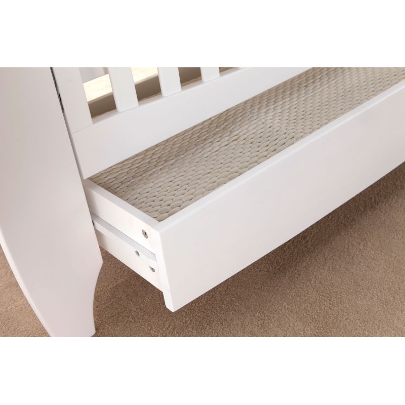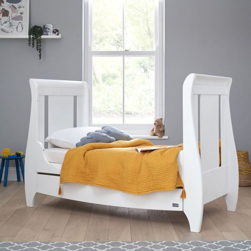 If you like elegance and sophistication, you’ll like the Modena cot bed, which has a contemporary and classy white and oak finish and gives a luxurious feel to a nursery. The Modena cot bed even converts into a sofa bed for additional seating once your little sweetheart reaches 4 years old. The Lucas and Roma cot beds have gorgeous sleigh shapes in a classic yet timeless design, and both come with a handy integrated drawer for additional storage. The Roma has a mini-size cot bed for smaller nurseries, so even little spaces can have gorgeous furniture.