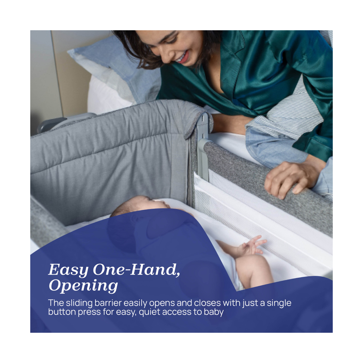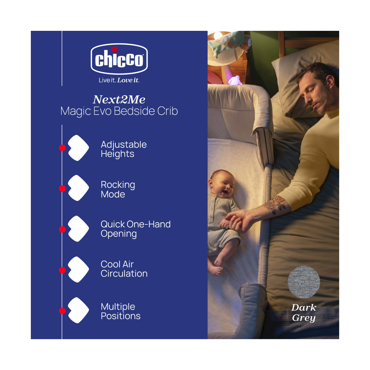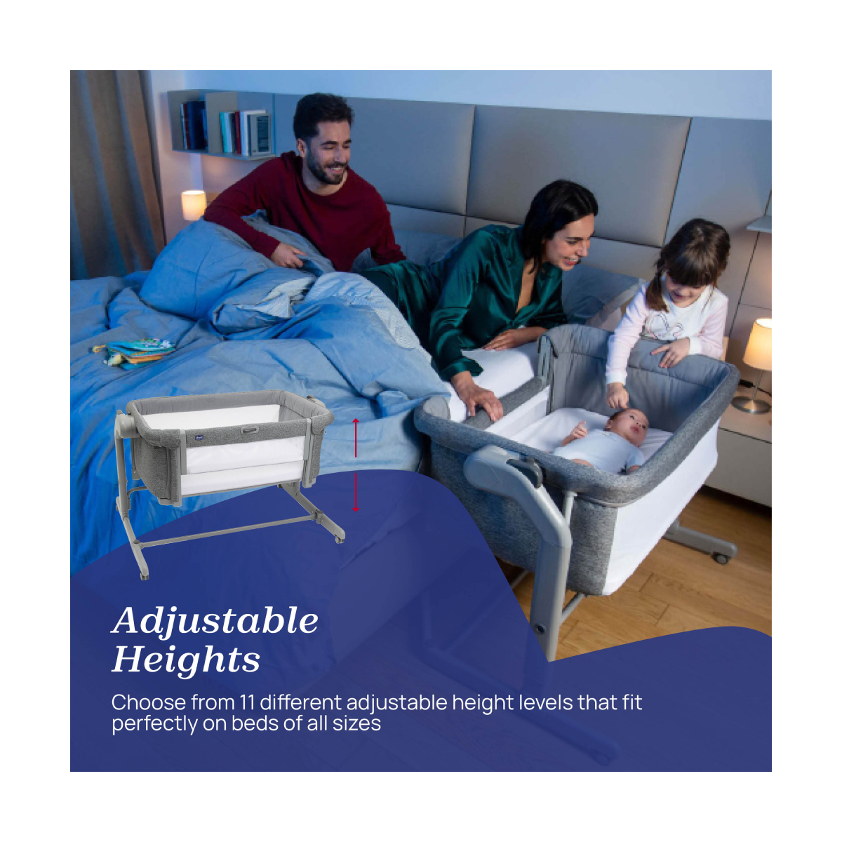 The Chicco Next2Me Dream Evo can be used as a standalone crib but also easily attaches to the bed, so your baby sleeps safely and comfortably by your side. It features 11 adjustable heights, complete with 4 tilt options that aid digestion and breathing.