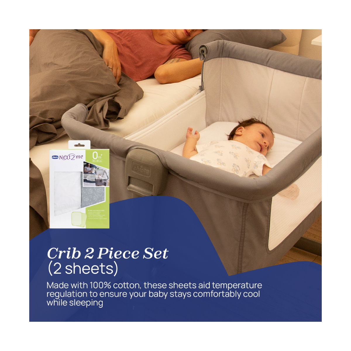 The Next2Me Essential Starter Bundle is a complete collection of our sleeping essentials for your little one to enjoy the best night’s sleep. The bundle includes the Dune Re_Lux Next2Me Essential bedside crib, which is environmentally friendly, with 62% of the crib’s soft fabric being made of softgood fabric that’s recycled polyester. It’s simple harness system firmly attaches the crib to your bed, providing a guaranteed safe night’s sleep for your little one and peace of mind for you. The mattress topper improves ventilation to reduce sweating, made from a breathable, honeycomb material that provides efficient air circulation. Create a comfortably cool night’s sleep for your little one. Also included in the bundle is a set of Grey Fox Fitted Sheets made with 100% cotton, offering the unique ability to aid temperature regulation, so your baby has a comfortably cool night’s sleep.