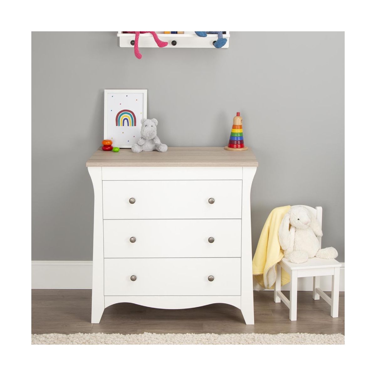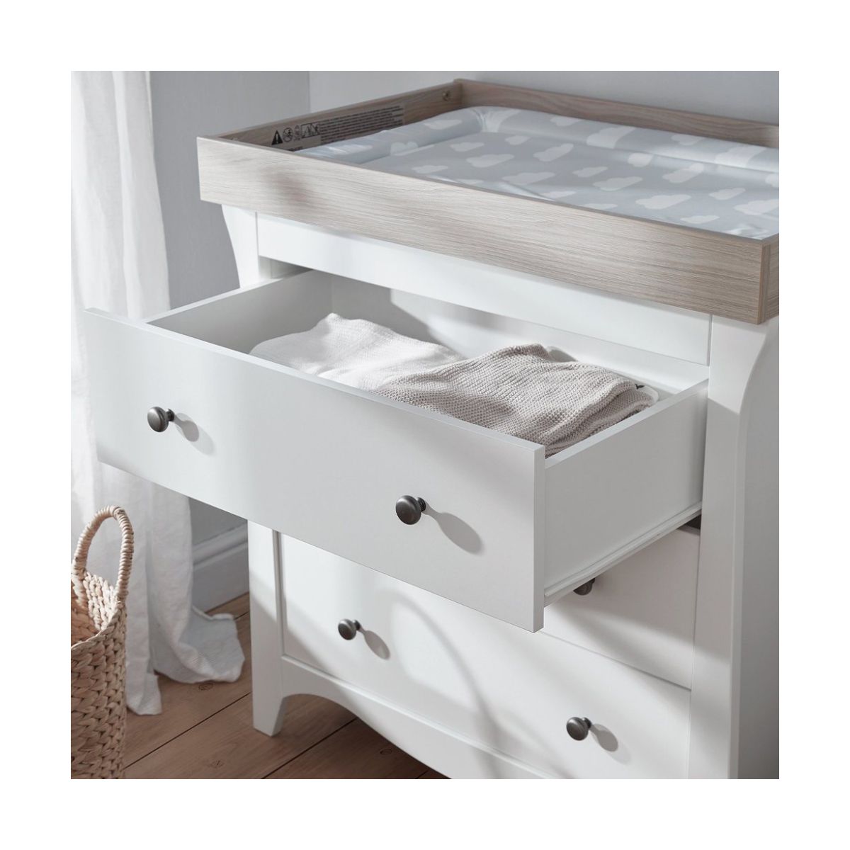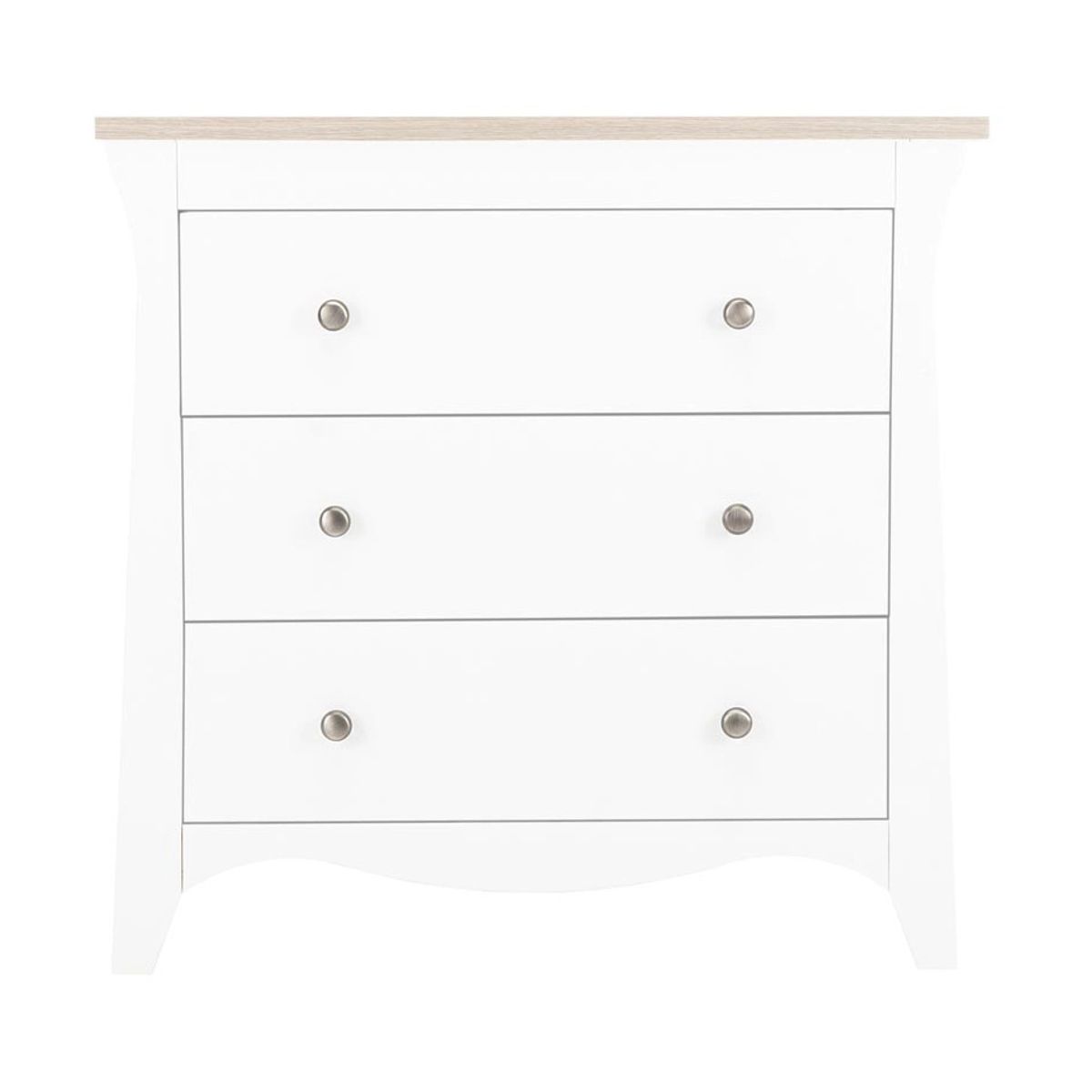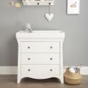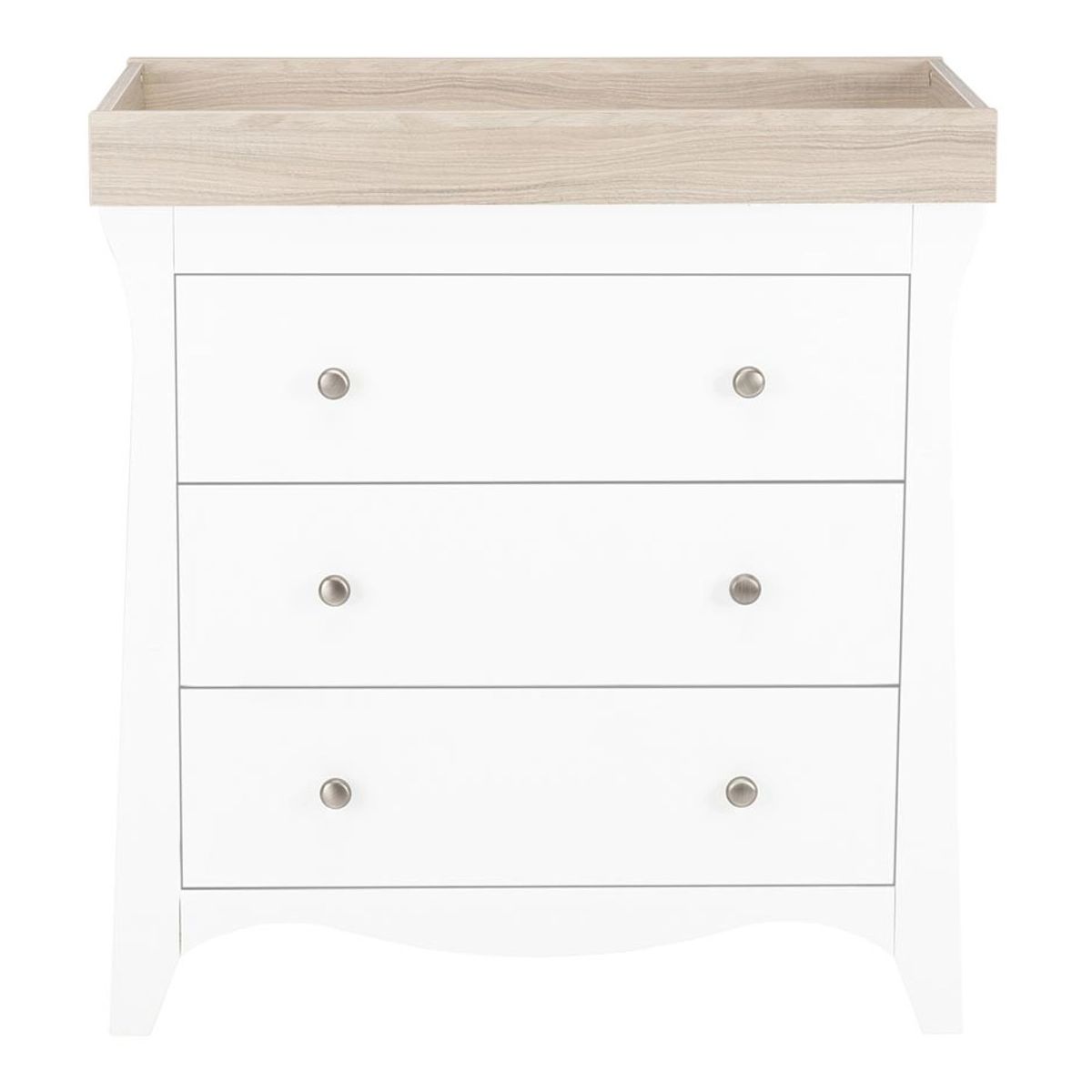 The CuddleCo Clara Dresser is a piece of fashionable and practical furniture to complete your fairy tale nursery. This stylish dresser features 3 spacious drawers, which can be arranged to store your baby clothes and nappy changing essentials. Classic curved shapes and modern brushed metal handles add this dresser an extraordinary contrasting appearance. It comes with a solidly made detachable changing station on top and wall strap kit for additional stability and safety. This furniture is carefully designed in Great Britain and made of solid pine and manufactured wood.