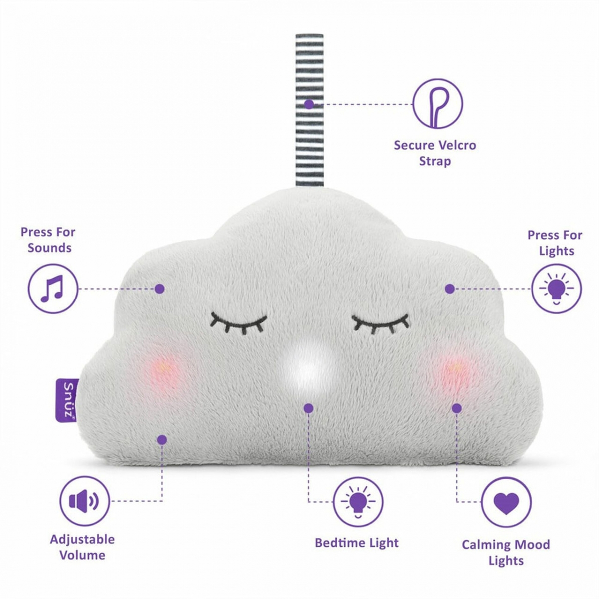 Settle your little baby to sleep with ease with SnuzCloud Baby Sleep Aid, a soft and stylish cloud full of magical features. Four soothing sounds including pink noise (up-to-date white noise alternative), mum's heartbeat, lullaby & waterfall reflecting tones will gently lull your little one. With the adjustable volume, you can make sure that the sound intensity is adequate to the distance from the toy to your beloved one.