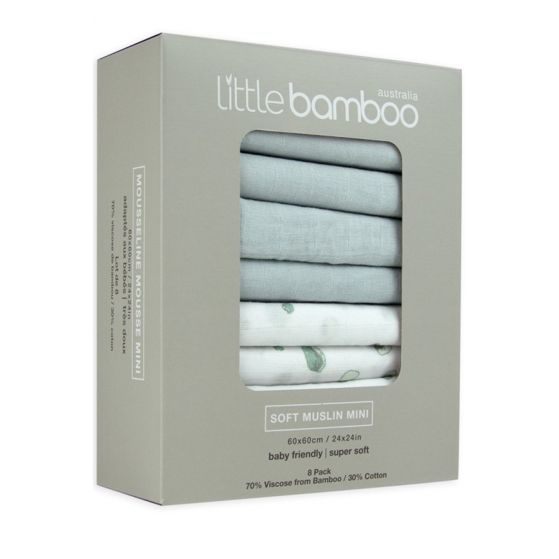 The Little Bamboo Muslin Squares 8 Pack is the perfect addition to your baby bag and nursery. Measuring 60 x 60cm these multi-use baby essentials can function as a burp cloth, comforter, bib, lightweight summer nappy/diaper, washcloth or wipe, change mat and more! Made from 70% viscose muslin and 30% cotton, they are silky smooth and gentle on baby's delicate skin. Packaged in a neat box, ideal for gifting.#