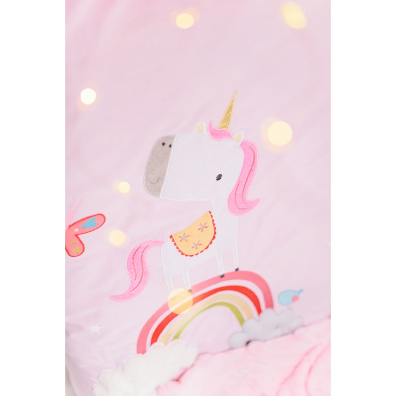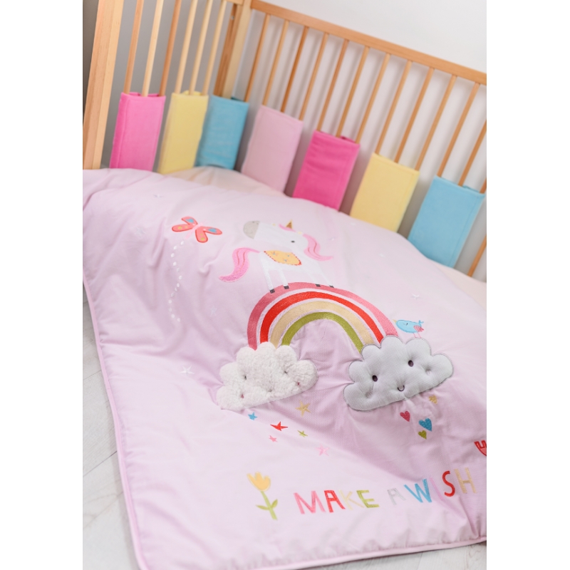 Add a little dash of pure magic to any nursery with our stunning Rainbows and Unicorns collection, ideal for any little girls new nursery. Fully applique bedding on stunning cotton pique fabrics in beautiful soft pinks, whites, and rainbow colour's, with a little dazzle of gold.