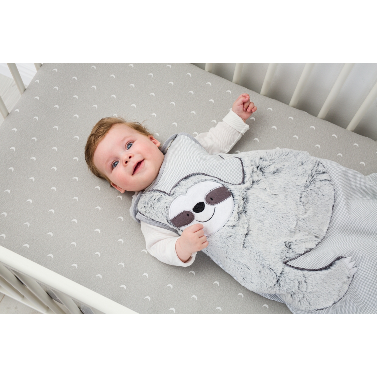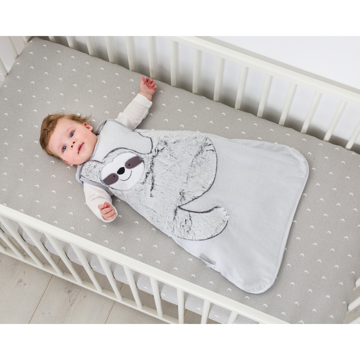 This Sidney the Sloth baby sleeping bag will keep your little one warm and secure at night with its 2.5 tog thickness. The beautifully soft jersey fabrics and soft fur applique sloth will help soothe your little one to sleep. The easy zipper opening means night time nappy changes are a breeze!