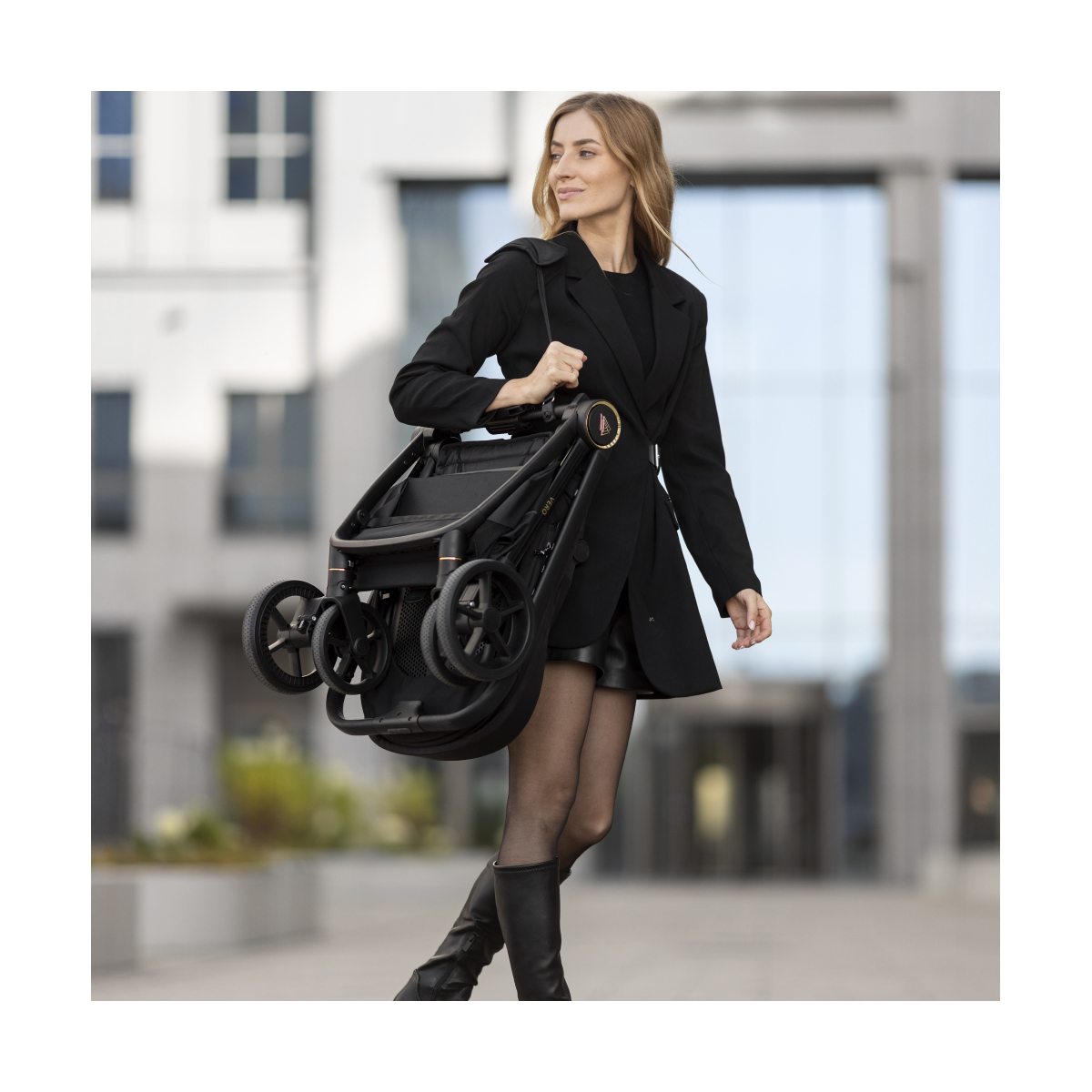 But that's not the end of the well-thought-out solutions in Venicci Vero. This stroller can serve you until your child reaches a weight of 22 kg. The magnetic harness buckle, crowned with luxurious design, catches attention. We've also included a strap for even more convenient transportation.