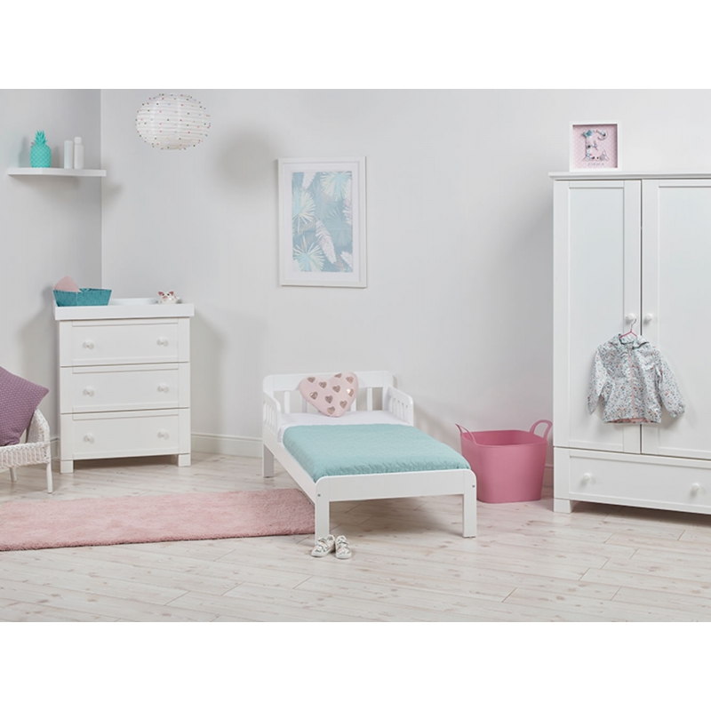 The Dakota Toddler Bed has a fresh, airy look, with open slatted sides and headboard. It features side rails to help stop your toddler rolling out of bed, making their transition from cot to bed more comfortable for them. The clean white finish will complement any style of nursery and bedding perfectly.