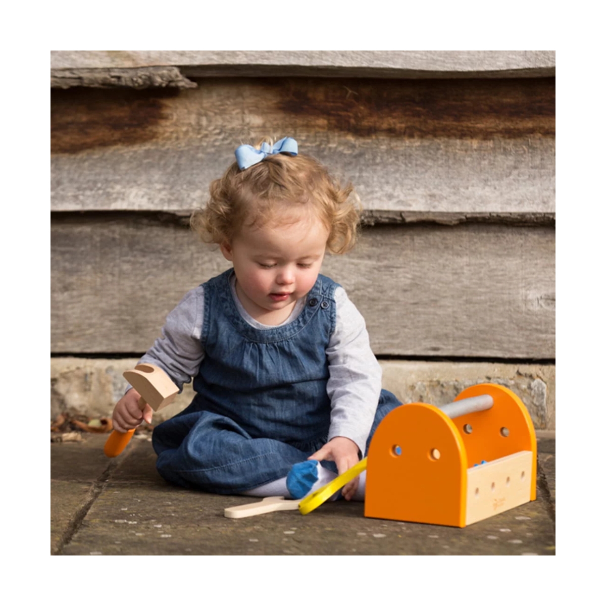 This small carpenter set will help your child develop concentration and fine motor skills with the ‘on-the-go’ set. Your child will learn to identify tools and how to use them, create separate structures or attach pieces to the side of the toolbox.