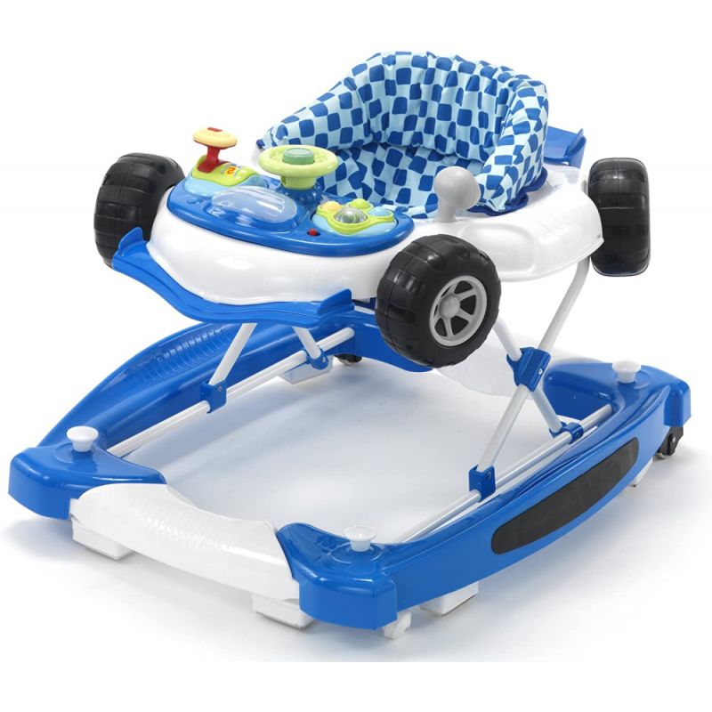 Superb racing car style rocker/walker for babies aged 6 months+ to 11kg. Detachable musical play tray adds to the excitement of this hugely popular walker. Check padded seat and foot pad with speed stripe stickers and moveable plastic tyres adding to the sense of fun.