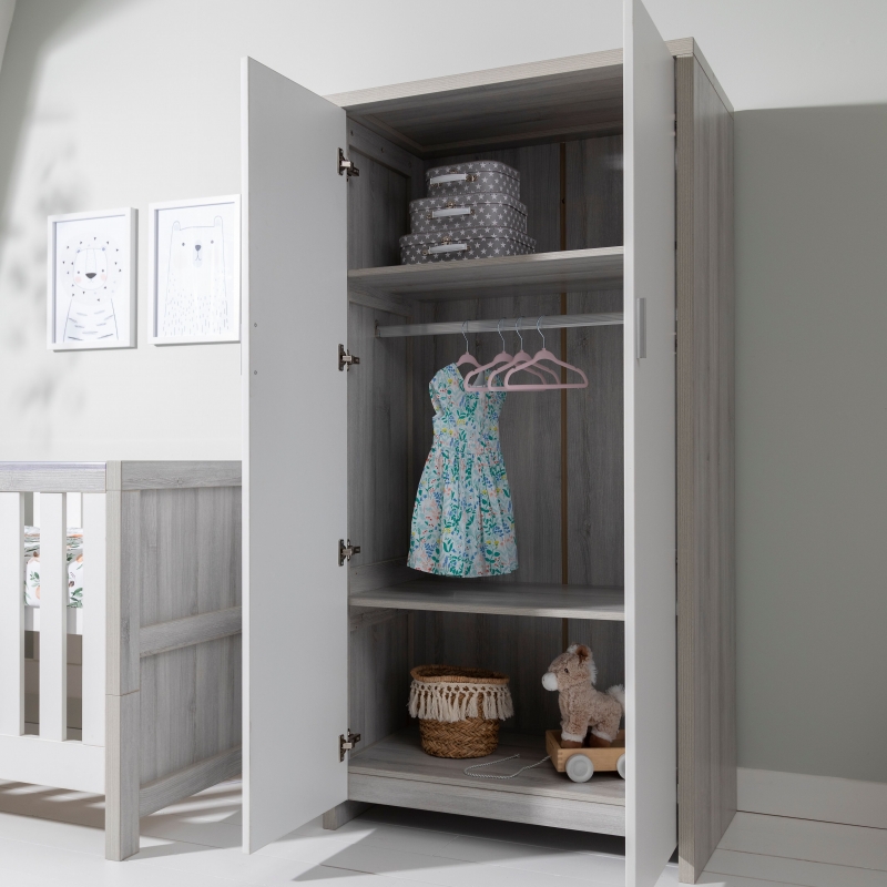 Perfect for storing all of your little one’s essentials, the Modena wardrobe features slow closing doors and combines a classic Grey finish with modern white detailing making it a beautiful contemporary choice for any nursery.