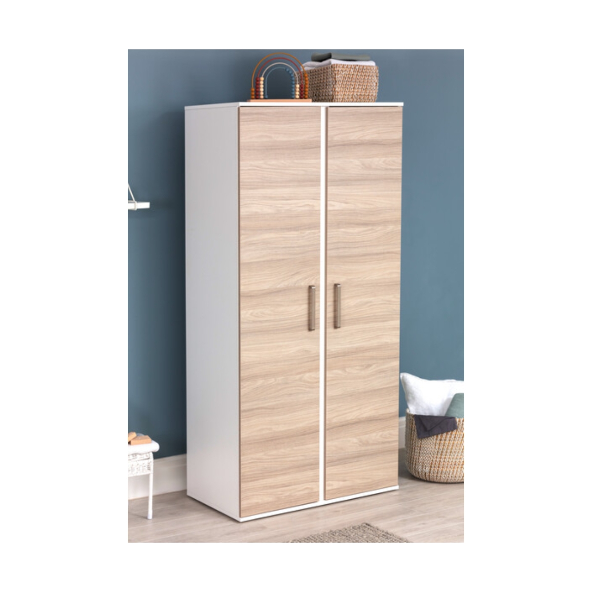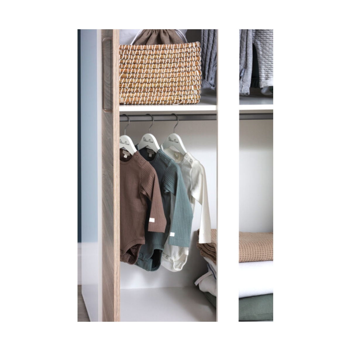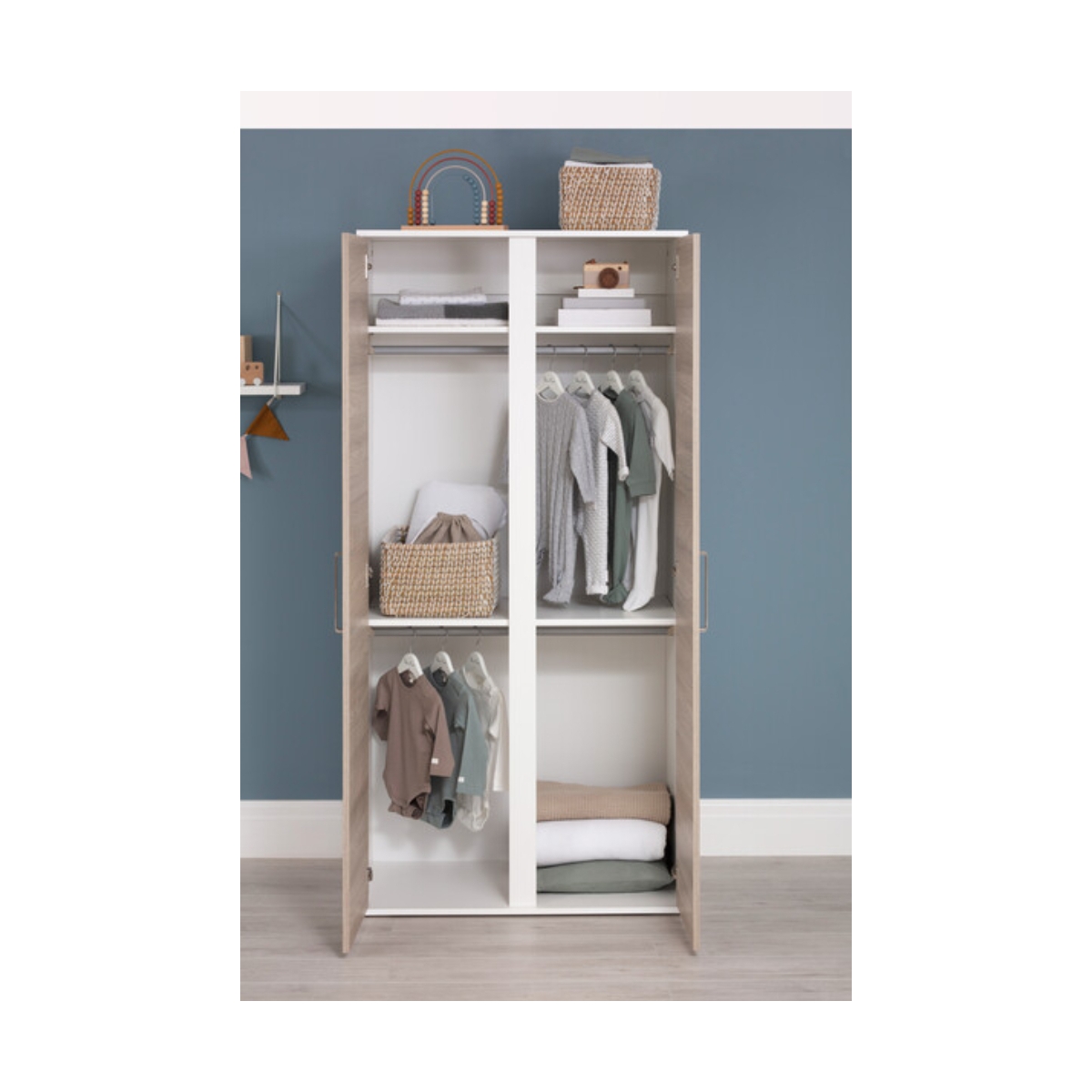 The Silver Cross Finchley full-size, two-door wardrobe comes with twin handing rails and shelves for ample storage. Finished in satin white and Nordic oak veneer with brushed satin chrome handles, it creates a beautiful but practical nursery.