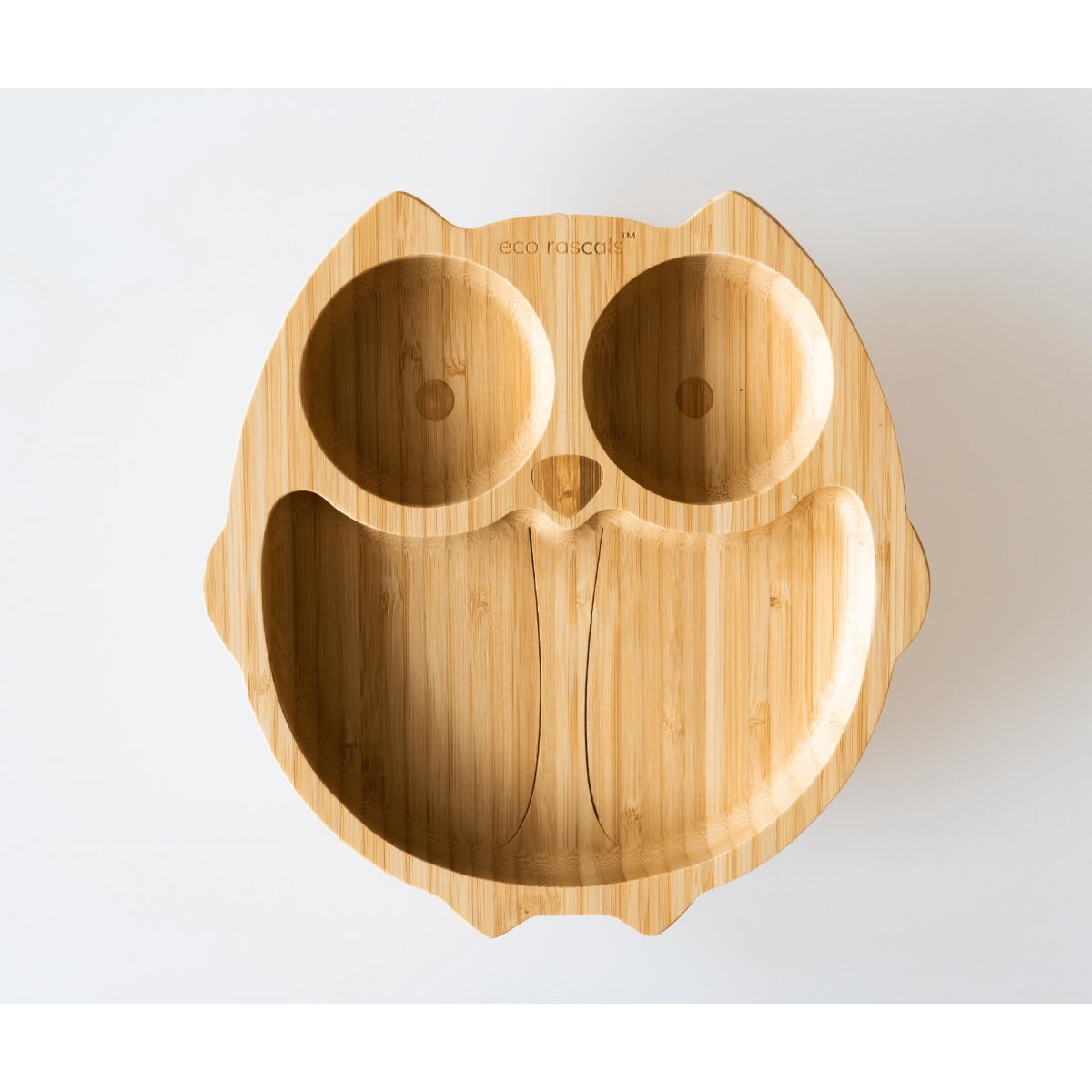 Natural bamboo owl shaped plate to make mealtimes happier. Two large sections to aid fussy eaters and encourage parents to serve a balanced meal. Super suction silicone bases to prevent the plate ending up on the floor. Cool to touch and easy to clean with warm soapy water.